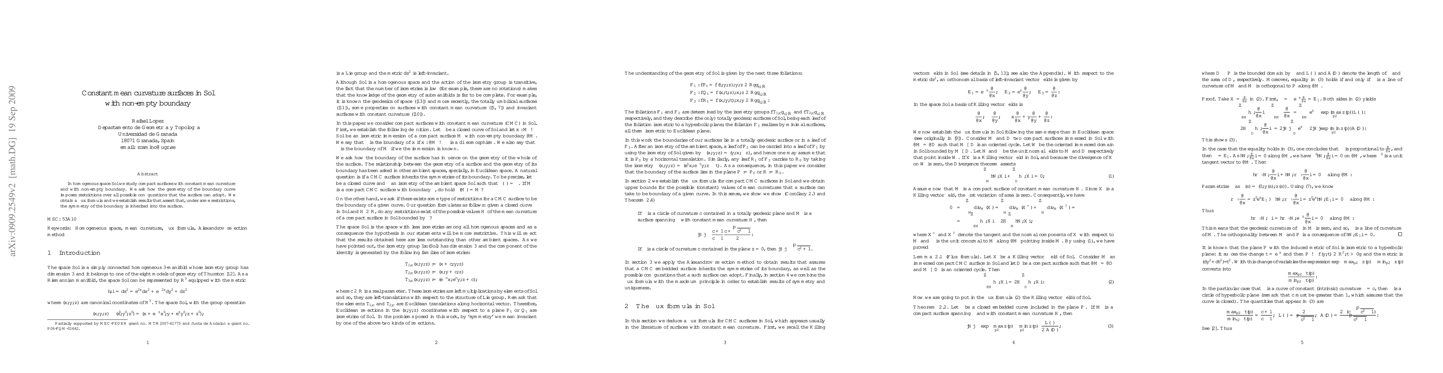 This paper investigates compact constant mean curvature surfaces in the homogeneous Sol space with non-empty boundary, deriving a flux formula and demonstrating that under certain conditions, the surface inherits the symmetry of its boundary.