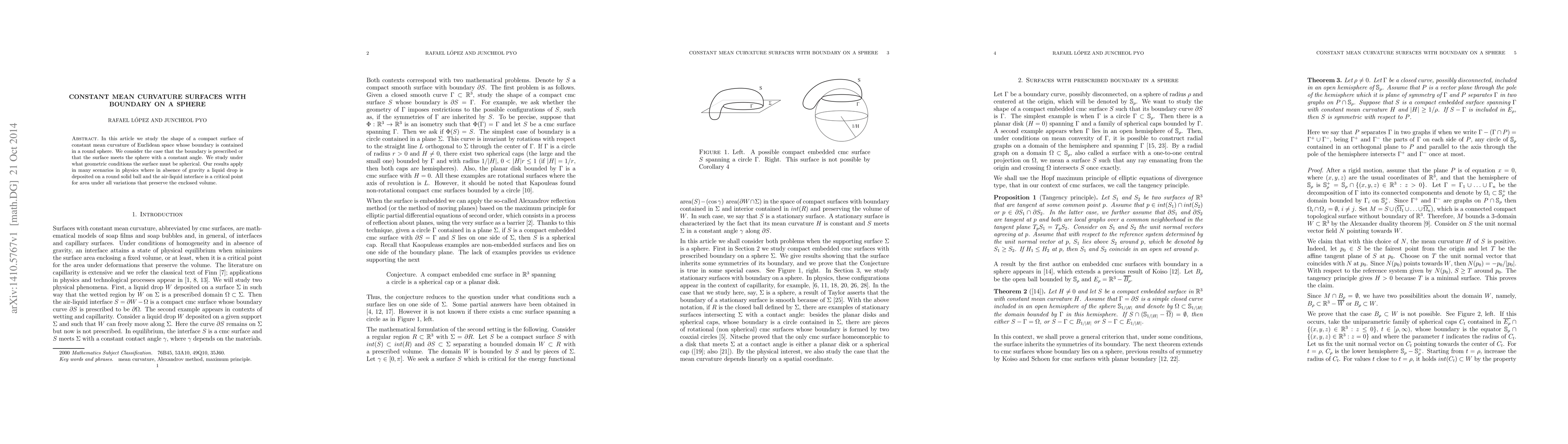 This paper investigates compact constant mean curvature surfaces in Euclidean space with boundaries on a sphere, exploring conditions under which such surfaces are spherical. It applies to physical scenarios where liquid drops on solid balls form minimal surfaces.