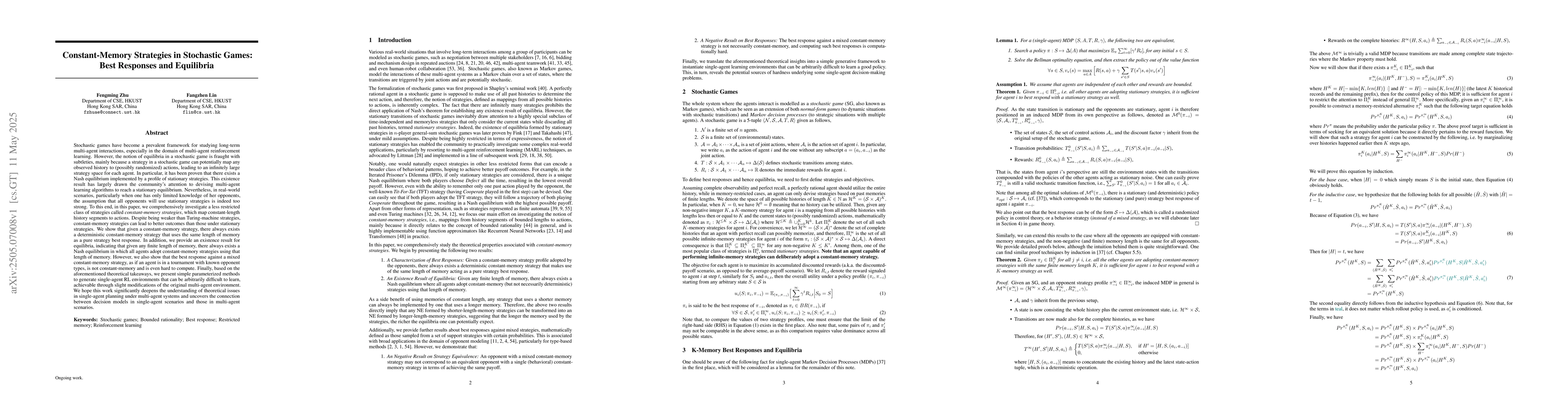This research paper explores constant-memory strategies in stochastic games, establishing best responses and Nash equilibria for behavioral strategies while discussing computational hardness and implications for reinforcement learning algorithms.
