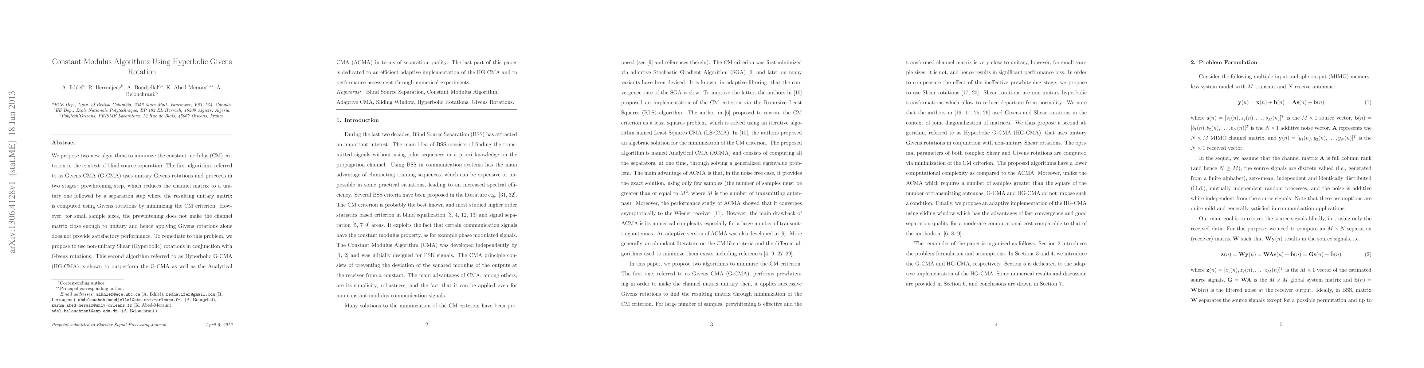 We propose two new algorithms to minimize the constant modulus (CM) criterion in the context of blind source separation. The first algorithm, referred to as Givens CMA (G-CMA) uses unitary Givens rotations and proceeds in two stages: prewhitening step, which reduces the channel matrix to a unitary one followed by a separation step where the resulting unitary matrix is computed using Givens rotations by minimizing the CM criterion. However, for small sample sizes, the prewhitening does not make the channel matrix close enough to unitary and hence applying Givens rotations alone does not provide satisfactory performance. To remediate to this problem, we propose to use non-unitary Shear (Hyperbolic) rotations in conjunction with Givens rotations. This second algorithm referred to as Hyperbolic G-CMA (HG-CMA) is shown to outperform the G-CMA as well as the Analytical CMA (ACMA) in terms of separation quality. The last part of this paper is dedicated to an efficient adaptive implementation of the HG-CMA and to performance assessment through numerical experiments.