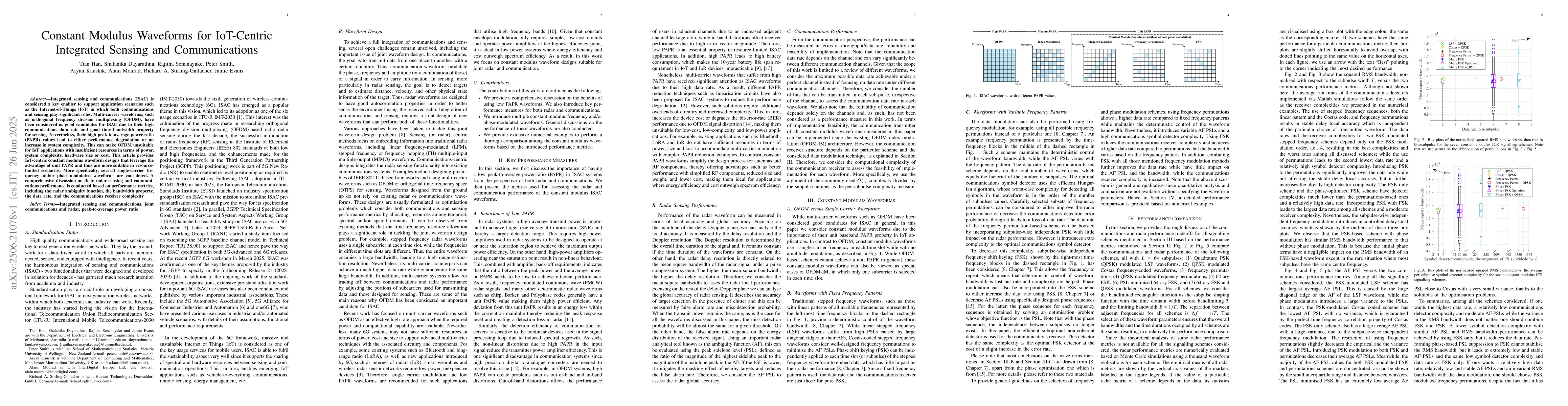 This research proposes IoT-focused constant modulus waveforms to address OFDM's high PAPR issues in ISAC. It explores single-carrier, phase/frequency-modulated waveforms, evaluating their radar sensing and communication performance using metrics like ambiguity function, bandwidth, data rate, and receiver complexity.