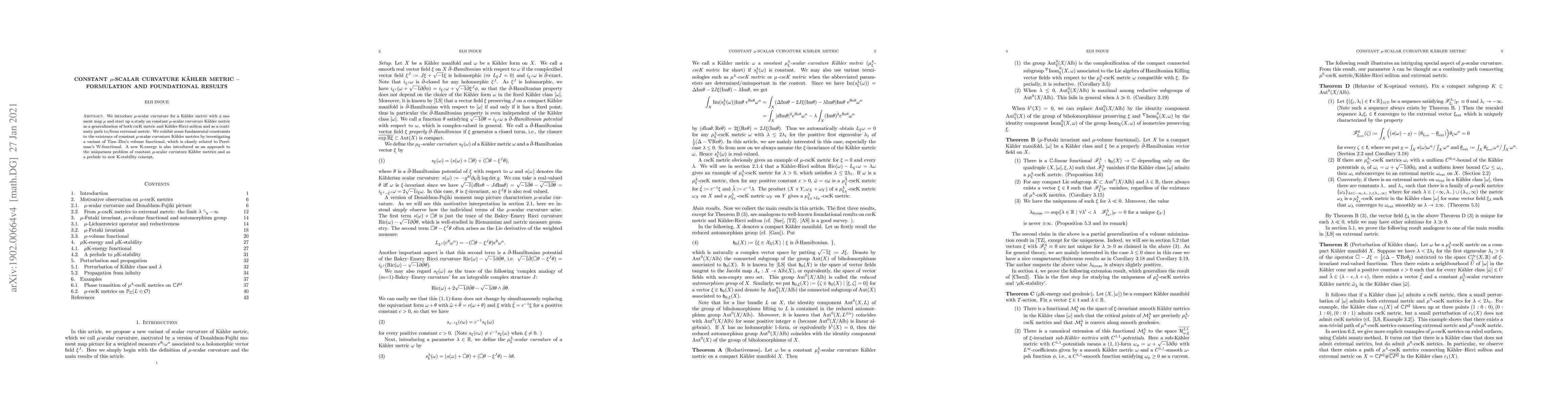 We introduce mu-scalar curvature for a K"ahler metric with a moment map mu and start up a study on constant mu-scalar curvature K"ahler metric as a generalization of both cscK metric and K"ahler-Ricci soliton and as a continuity path to extremal metric. We study some fundamental constraints to the existence of constant mu-scalar curvature K"ahler metric by investigating a volume functional as a generalization of Tian-Zhu's work, which is closely related to Perelman's W-functional. A new K-energy is studied as an approach to the uniqueness problem of constant mu-scalar curvature and as a prelude to new K-stability concept.