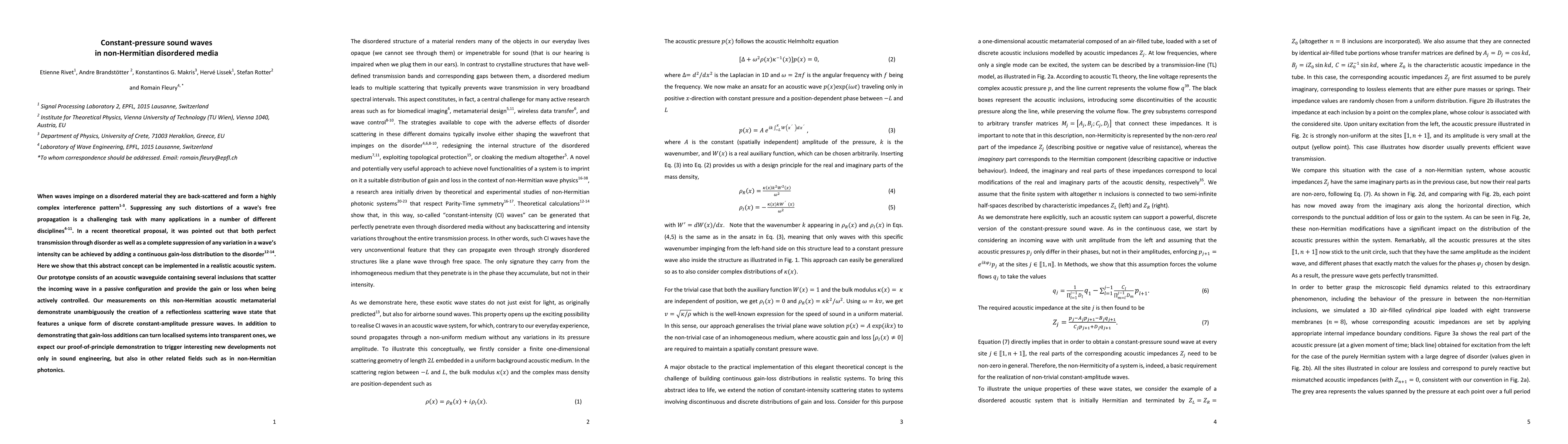 This paper demonstrates the implementation of a theoretical concept where constant-pressure sound waves are achieved in non-Hermitian disordered media by adding gain-loss distributions. The study shows a prototype acoustic metamaterial that creates a reflectionless scattering wave state, highlighting potential applications in sound engineering and related fields.