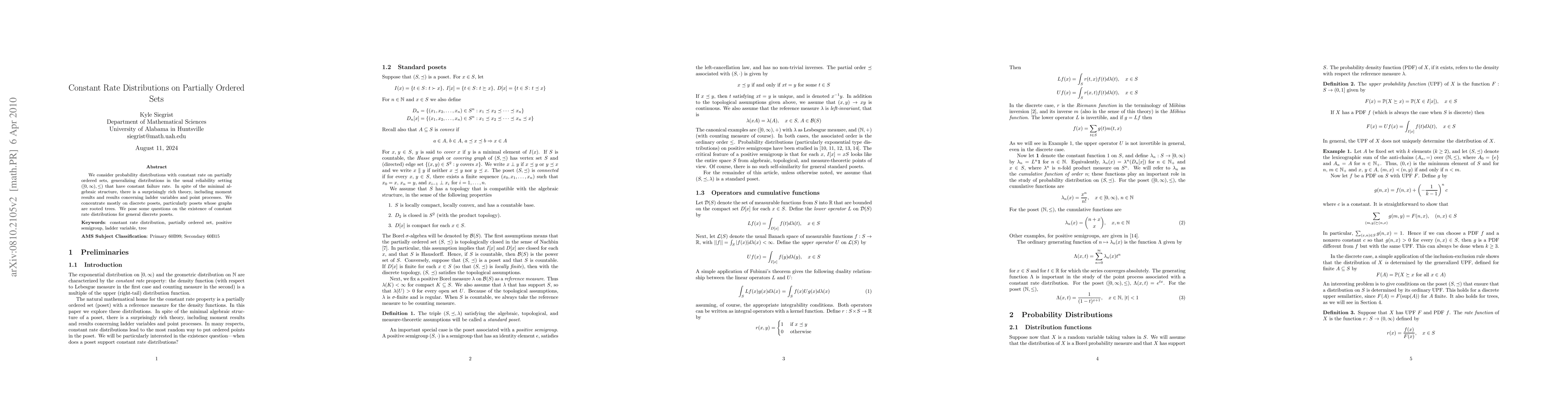 We consider probability distributions with constant rate on partially ordered sets, generalizing distributions in the usual reliability setting that have constant failure rate. In spite of the minimal algebraic structure, there is a surprisingly rich theory, including moment results and results concerning ladder variables and point processes. We concentrate mostly on discrete posets, particularly posets whose graphs are rooted trees. We pose some questions on the existence of constant rate distributions for general discrete posets.