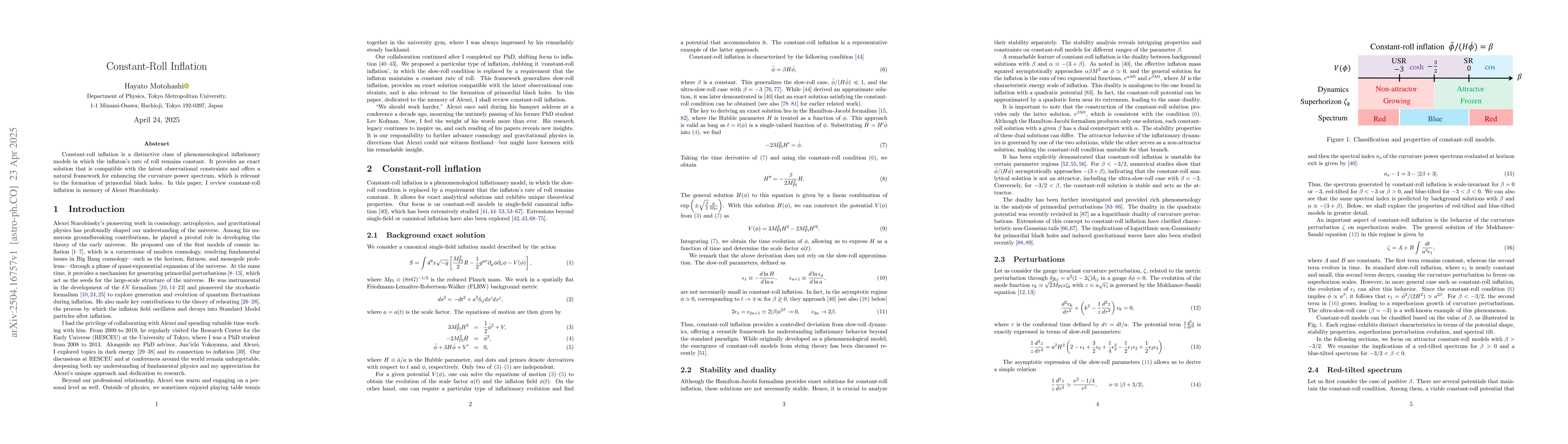 Summary: This paper reviews constant-roll inflation, a unique inflationary model where the inflaton's rate of roll is constant, providing a solution that aligns with observational data and potentially enhances the curvature power spectrum for primordial black hole formation. The review is dedicated to Alexei Starobinsky.