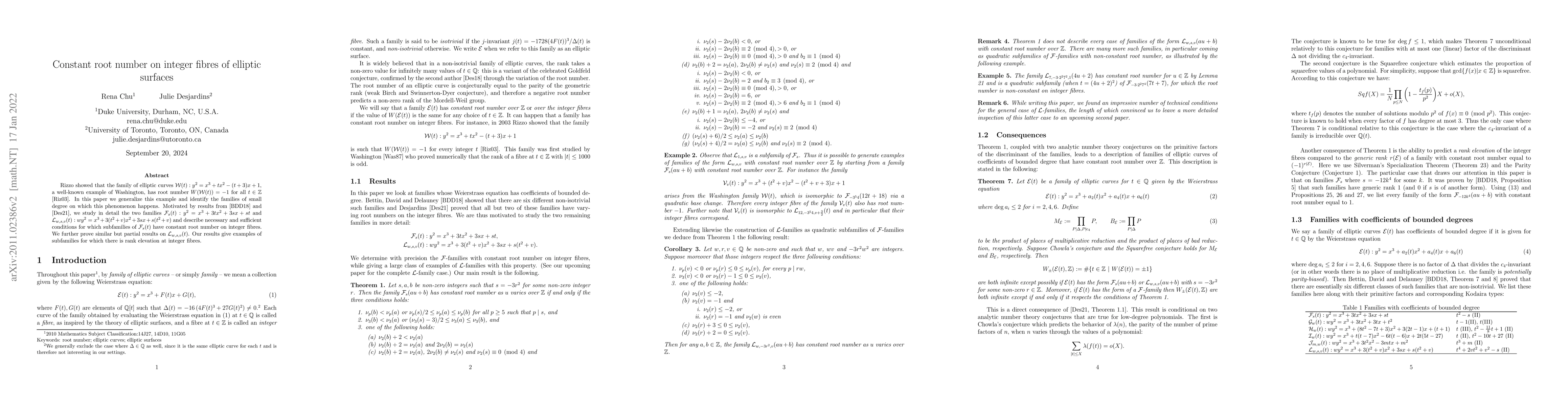 Researchers studied families of elliptic curves with constant root number on integer fibers, finding necessary conditions for this phenomenon to occur, and providing examples of subfamilies with rank elevation at integer fibers.