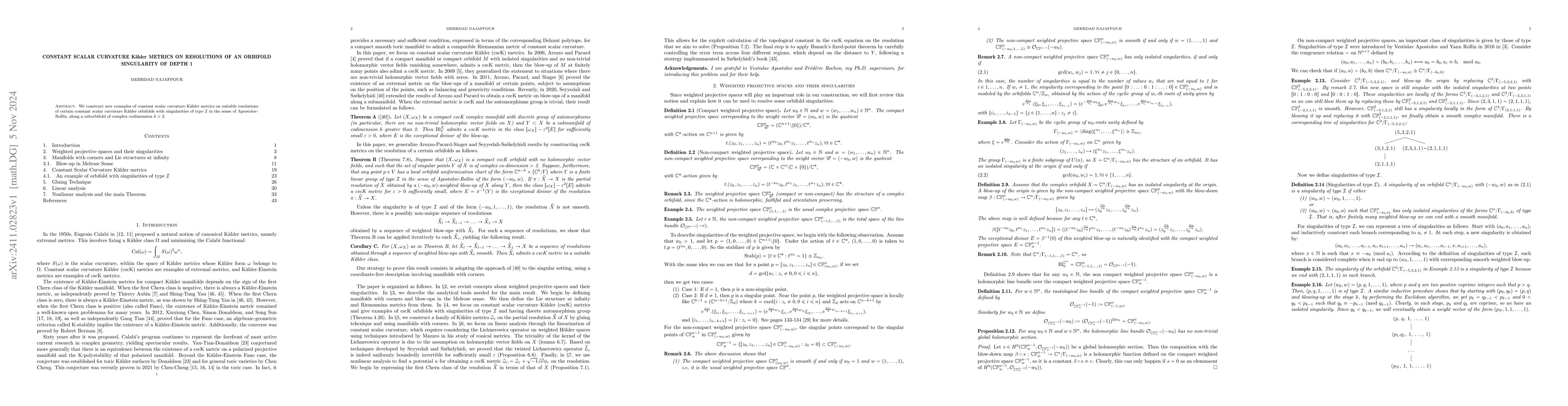 Summary: The paper constructs new constant scalar curvature Kähler metrics on resolutions for specific orbifold singularities of depth 1, enhancing the understanding of Kähler metrics in complex geometry. The focus is on resolving type I singularities along suborbifolds of high complex codimension.