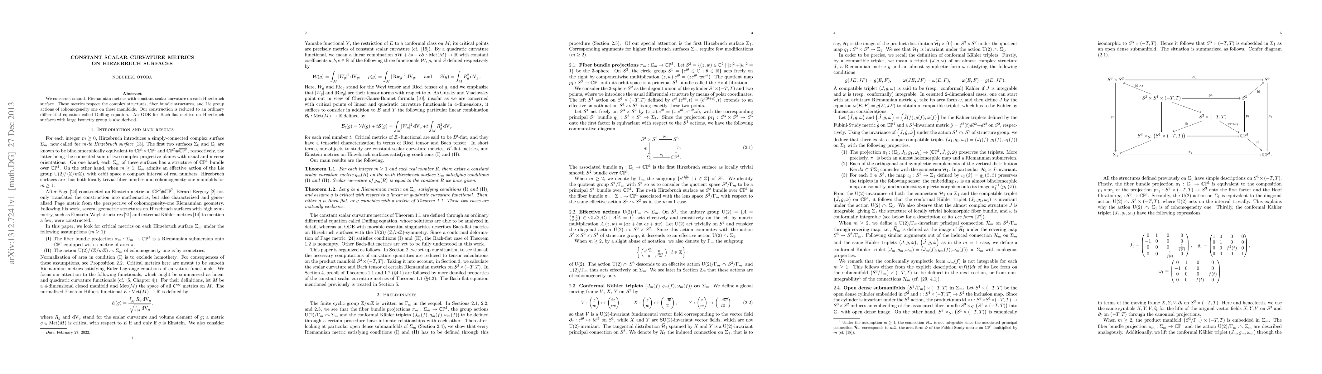 This paper constructs smooth Riemannian metrics on Hirzebruch surfaces with constant scalar curvature, respecting their complex and fiber bundle structures, and derived from a Duffing equation. Additionally, it presents an ODE for Bach-flat metrics on these surfaces with large isometry groups.