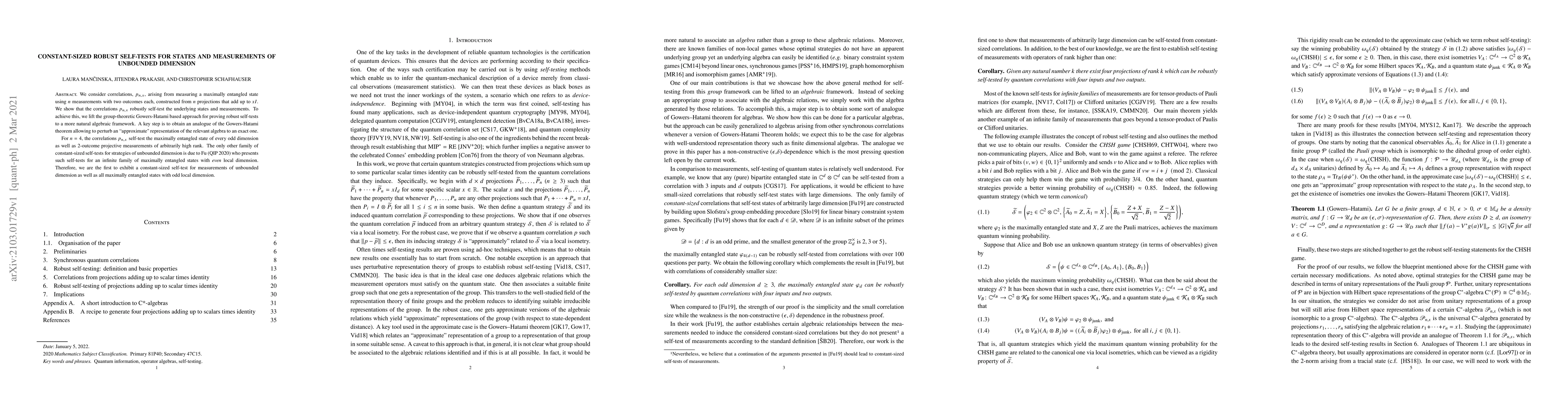We consider correlations, $p_{n,x}$, arising from measuring a maximally entangled state using $n$ measurements with two outcomes each, constructed from $n$ projections that add up to $xI$. We show that the correlations $p_{n,x}$ robustly self-test the underlying states and measurements. To achieve this, we lift the group-theoretic Gowers-Hatami based approach for proving robust self-tests to a more natural algebraic framework. A key step is to obtain an analogue of the Gowers-Hatami theorem allowing to perturb an "approximate" representation of the relevant algebra to an exact one. For $n=4$, the correlations $p_{n,x}$ self-test the maximally entangled state of every odd dimension as well as 2-outcome projective measurements of arbitrarily high rank. The only other family of constant-sized self-tests for strategies of unbounded dimension is due to Fu (QIP 2020) who presents such self-tests for an infinite family of maximally entangled states with even local dimension. Therefore, we are the first to exhibit a constant-sized self-test for measurements of unbounded dimension as well as all maximally entangled states with odd local dimension.