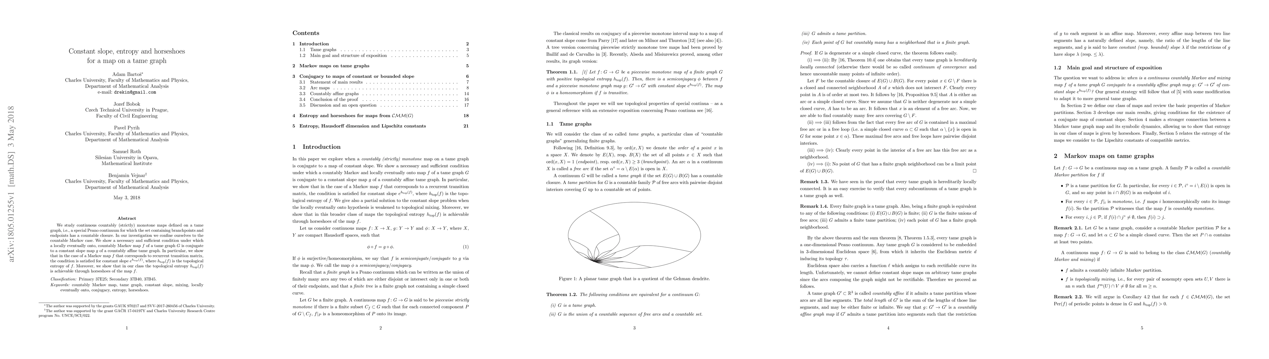 We study continuous countably (strictly) monotone maps defined on a tame graph, i.e., a special Peano continuum for which the set containing branchpoints and endpoints has a countable closure. In our investigation we confine ourselves to the countable Markov case. We show a necessary and sufficient condition under which a locally eventually onto, countably Markov map $f$ of a tame graph $G$ is conjugate to a constant slope map $g$ of a countably affine tame graph. In particular, we show that in the case of a Markov map $f$ that corresponds to recurrent transition matrix, the condition is satisfied for constant slope $e^{h_{\operatorname{top}}(f)}$, where $h_{\operatorname{top}}(f)$ is the topological entropy of $f$. Moreover, we show that in our class the topological entropy $h_{\operatorname{top}}(f)$ is achievable through horseshoes of the map $f$.