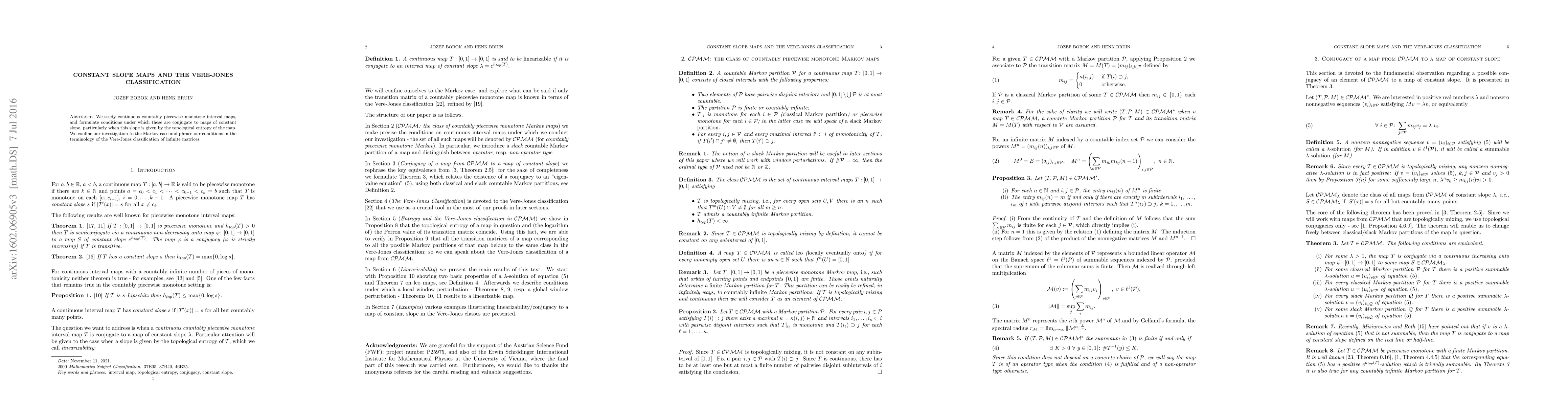 This paper investigates continuous countably piecewise monotone interval maps, establishing conditions for their conjugacy to maps of constant slope, specifically when the slope equals the map's topological entropy, within the context of the Markov case and using the Vere-Jones classification of infinite matrices.