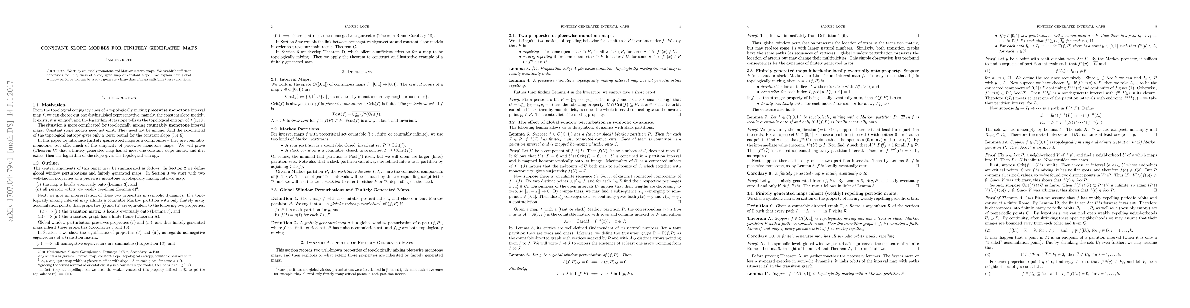 We study countably monotone and Markov interval maps. We establish sufficient conditions for uniqueness of a conjugate map of constant slope. We explain how global window perturbation can be used to generate a large class of maps satisfying these conditions.