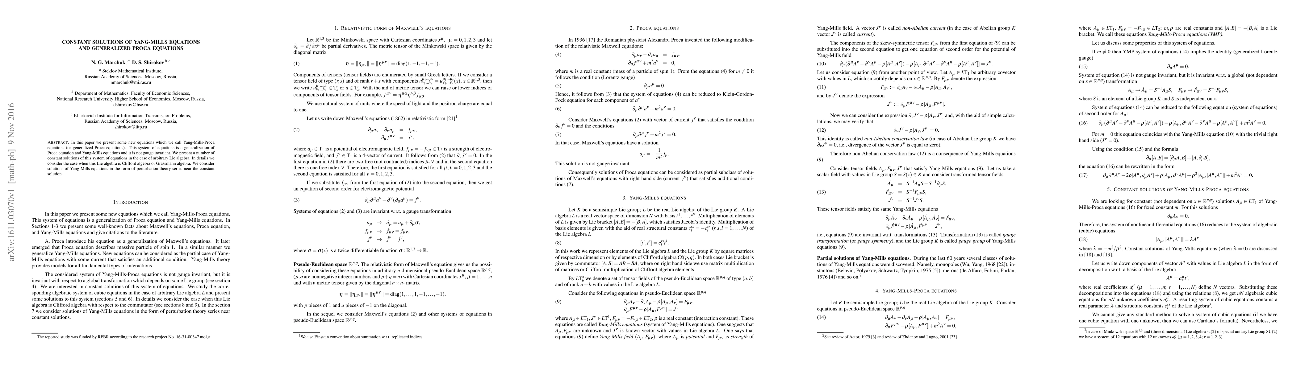 Summary: The paper introduces the Yang-Mills-Proca (generalized Proca) equations, a non-gauge invariant system extending both Proca and Yang-Mills equations. It provides constant solutions for this system under arbitrary Lie algebra, specifically focusing on Clifford and Grassmann algebras, and examines perturbations around these constants.