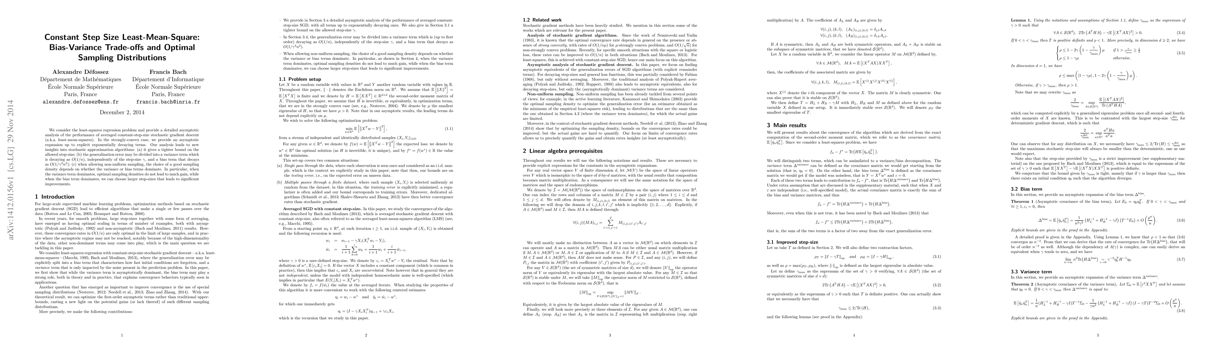 We consider the least-squares regression problem and provide a detailed asymptotic analysis of the performance of averaged constant-step-size stochastic gradient descent (a.k.a. least-mean-squares). In the strongly-convex case, we provide an asymptotic expansion up to explicit exponentially decaying terms. Our analysis leads to new insights into stochastic approximation algorithms: (a) it gives a tighter bound on the allowed step-size; (b) the generalization error may be divided into a variance term which is decaying as O(1/n), independently of the step-size $\gamma$, and a bias term that decays as O(1/$\gamma$ 2 n 2); (c) when allowing non-uniform sampling, the choice of a good sampling density depends on whether the variance or bias terms dominate. In particular, when the variance term dominates, optimal sampling densities do not lead to much gain, while when the bias term dominates, we can choose larger step-sizes that leads to significant improvements.