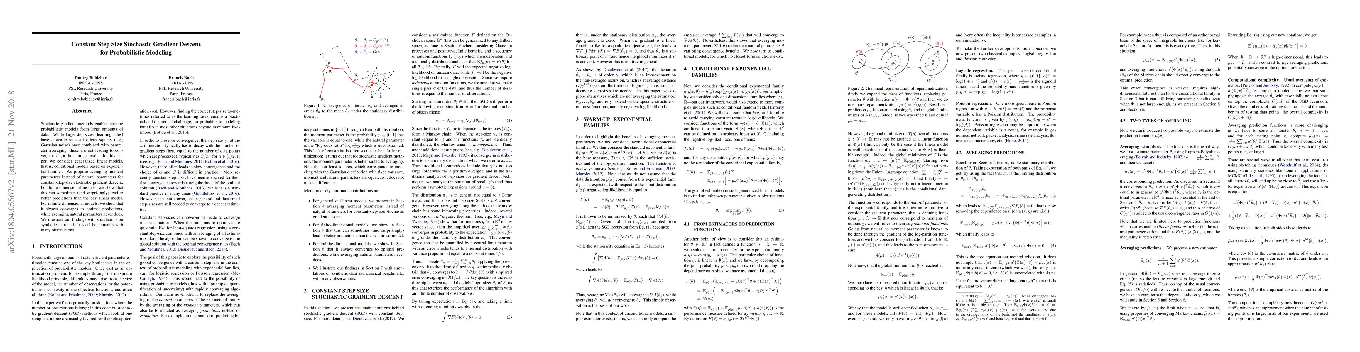 This paper proposes a constant-step-size stochastic gradient descent method for probabilistic modeling, averaging moment parameters instead of natural parameters, which leads to better predictions and convergence for generalized linear models, especially infinite-dimensional ones. The method's effectiveness is demonstrated through simulations and benchmarks.