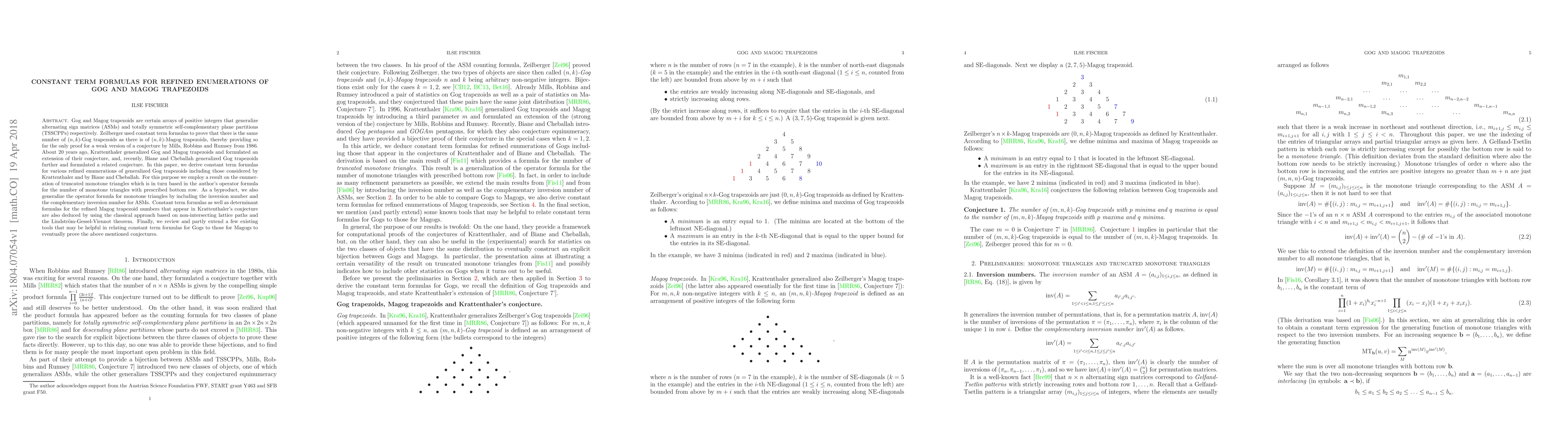 Gog and Magog trapezoids are certain arrays of positive integers that generalize alternating sign matrices (ASMs) and totally symmetric self-complementary plane partitions (TSSCPPs) respectively. Zeilberger used constant term formulas to prove that there is the same number of (n,k)-Gog trapezoids as there is of (n,k)-Magog trapezoids, thereby providing so far the only proof for a weak version of a conjecture by Mills, Robbins and Rumsey from 1986. About 20 years ago, Krattenthaler generalized Gog and Magog trapezoids and formulated an extension of their conjecture, and, recently, Biane and Cheballah generalized Gog trapezoids further and formulated a related conjecture. In this paper, we derive constant term formulas for various refined enumerations of generalized Gog trapezoids including those considered by Krattenthaler and by Biane and Cheballah. For this purpose we employ a result on the enumeration of truncated monotone triangles which is in turn based in the author's operator formula for the number of monotone triangles with prescribed bottom row. As a byproduct, we also generalize the operator formula for monotone triangles by including the inversion number and the complementary inversion number for ASMs. Constant term formulas as well as determinant formulas for the refined Magog trapezoid numbers that appear in Krattenthaler's conjecture are also deduced by using the classical approach based on non-intersecting lattice paths and the Lindstr\"om-Gessel-Viennot theorem. Finally, we review and partly extend a few existing tools that may be helpful in relating constant term formulas for Gogs to those for Magogs to eventually prove the above mentioned conjectures.
