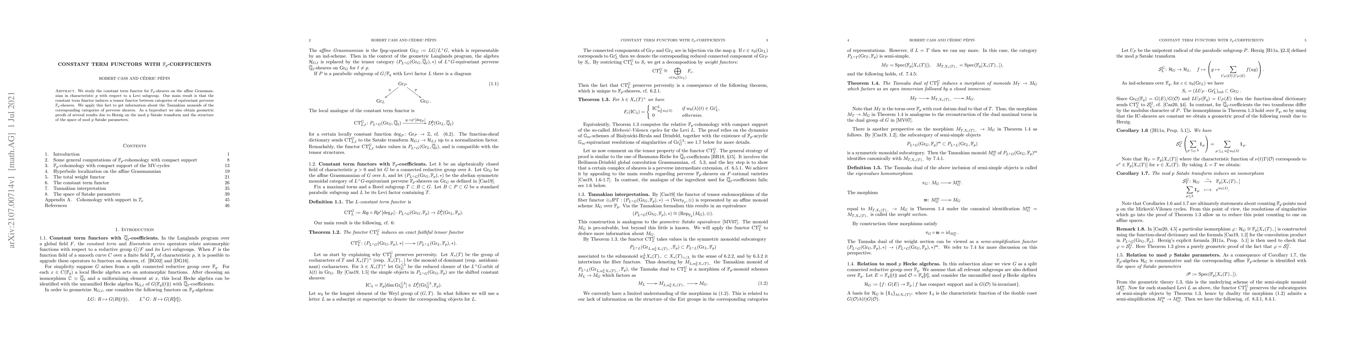 We study the constant term functor for $\mathbb{F}_p$-sheaves on the affine Grassmannian in characteristic $p$ with respect to a Levi subgroup. Our main result is that the constant term functor induces a tensor functor between categories of equivariant perverse $\mathbb{F}_p$-sheaves. We apply this fact to get information about the Tannakian monoids of the corresponding categories of perverse sheaves. As a byproduct we also obtain geometric proofs of several results due to Herzig on the mod $p$ Satake transform and the structure of the space of mod $p$ Satake parameters.