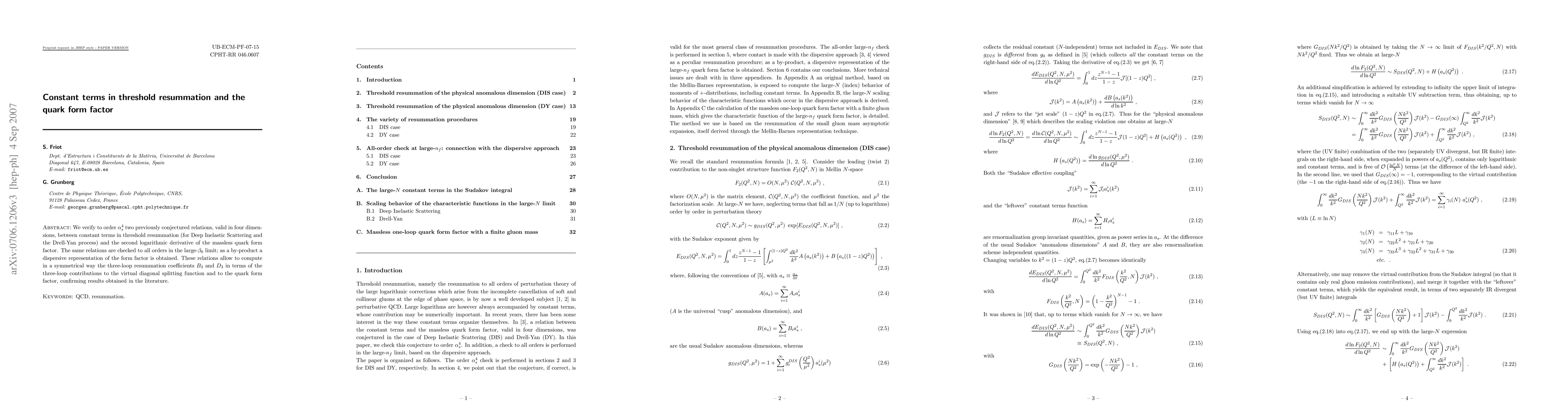 Researchers verified relations between threshold resummation constant terms and the quark form factor, allowing for symmetrical computation of resummation coefficients and a dispersive representation of the form factor.