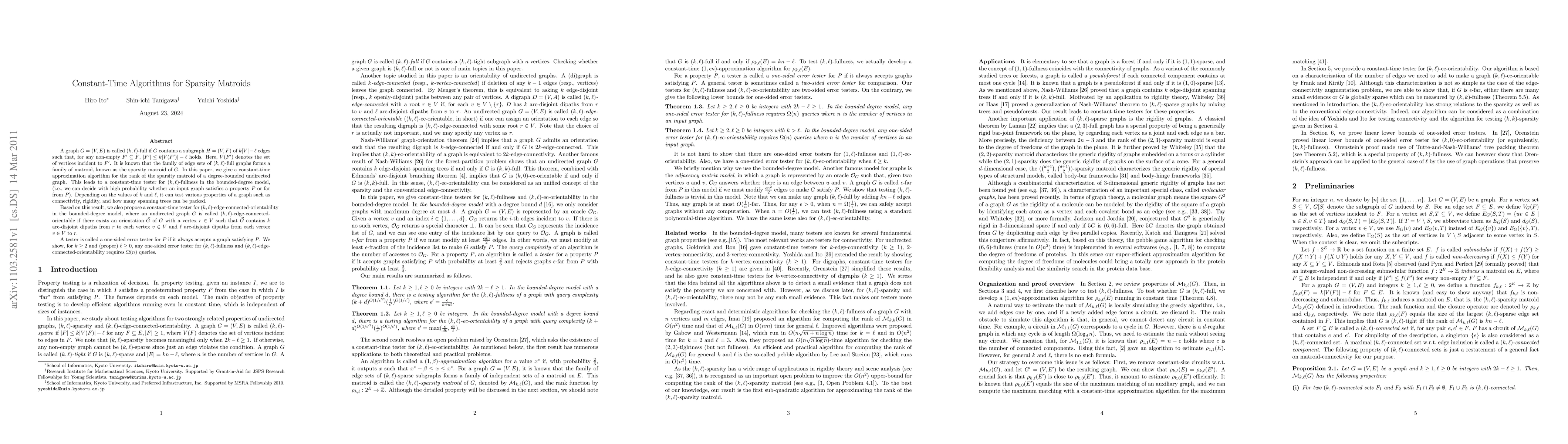 A graph $G=(V,E)$ is called $(k,\ell)$-full if $G$ contains a subgraph $H=(V,F)$ of $k|V|-\ell$ edges such that, for any non-empty $F' \subseteq F$, $|F'| \leq k|V(F')| - \ell$ holds. Here, $V(F')$ denotes the set of vertices incident to $F'$. It is known that the family of edge sets of $(k,\ell)$-full graphs forms a family of matroid, known as the sparsity matroid of $G$. In this paper, we give a constant-time approximation algorithm for the rank of the sparsity matroid of a degree-bounded undirected graph. This leads to a constant-time tester for $(k,\ell)$-fullness in the bounded-degree model, (i.e., we can decide with high probability whether an input graph satisfies a property $P$ or far from $P$). Depending on the values of $k$ and $\ell$, it can test various properties of a graph such as connectivity, rigidity, and how many spanning trees can be packed. Based on this result, we also propose a constant-time tester for $(k,\ell)$-edge-connected-orientability in the bounded-degree model, where an undirected graph $G$ is called $(k,\ell)$-edge-connected-orientable if there exists an orientation $\vec{G}$ of $G$ with a vertex $r \in V$ such that $\vec{G}$ contains $k$ arc-disjoint dipaths from $r$ to each vertex $v \in V$ and $\ell$ arc-disjoint dipaths from each vertex $v \in V$ to $r$. A tester is called a one-sided error tester for $P$ if it always accepts a graph satisfying $P$. We show, for $k \geq 2$ and (proper) $\ell \geq 0$, any one-sided error tester for $(k,\ell)$-fullness and $(k,\ell)$-edge-connected-orientability requires $\Omega(n)$ queries.