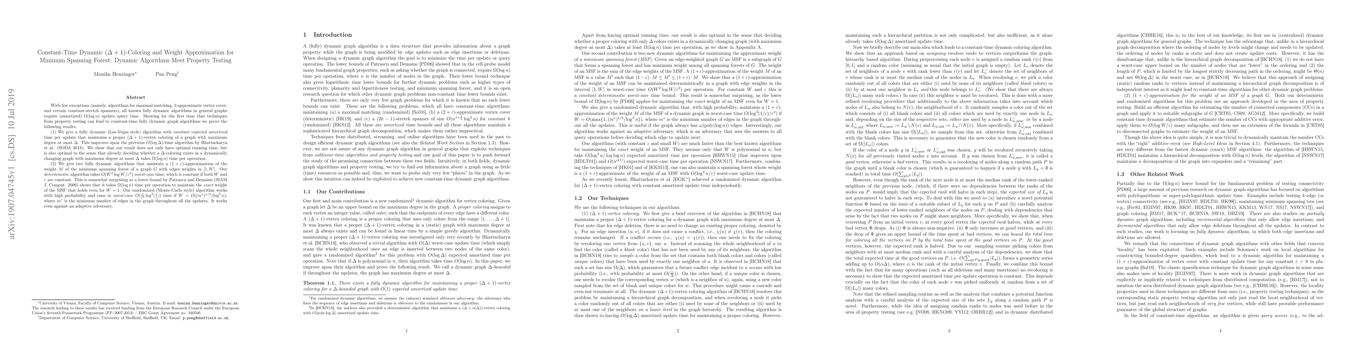 With few exceptions (namely, algorithms for maximal matching, $2$-approximate vertex cover, and certain constant-stretch spanners), all known fully dynamic algorithms in general graphs require (amortized) $\Omega(\log n)$ update/query time. Showing for the first time that techniques from property testing can lead to constant-time fully dynamic graph algorithms we prove the following results: (1) We give a fully dynamic (Las-Vegas style) algorithm with constant expected amortized time per update that maintains a proper $(\Delta+1)$-vertex coloring of a graph with maximum degree at most $\Delta$. This improves upon the previous $O(\log \Delta)$-time algorithm by Bhattacharya et al. (SODA 2018). We show that our result does not only have optimal running time, but is also optimal in the sense that already deciding whether a $\Delta$-coloring exists in a dynamically changing graph with maximum degree at most $\Delta$ takes $\Omega(\log n)$ time per operation. (2) We give two fully dynamic algorithms that maintain a $(1+\varepsilon)$-approximation of the weight $M$ of the minimum spanning forest of a graph $G$ with edges weights in $[1,W]$. Our deterministic algorithm takes $O({W^2 \log W}/{\varepsilon^3})$ worst-case time, which is constant if both $W$ and $\varepsilon$ are constant. This is somewhat surprising as a lower bound by Patrascu and Demaine (SIAM J. Comput. 2006) shows that it takes $\Omega(\log n)$ time per operation to maintain the exact weight of the MSF that holds even for $W=1$. Our randomized (Monte-Carlo style) algorithm works with high probability and runs in worst-case $O(\frac{1}{\varepsilon^4}\log^2(\frac{1}{\varepsilon}))$ time if $W= O({(m^*)^{1/3}}/{\log^3 n})$, where $m^*$ is the minimum number of edges in the graph throughout all the updates. It works even against an adaptive adversary.