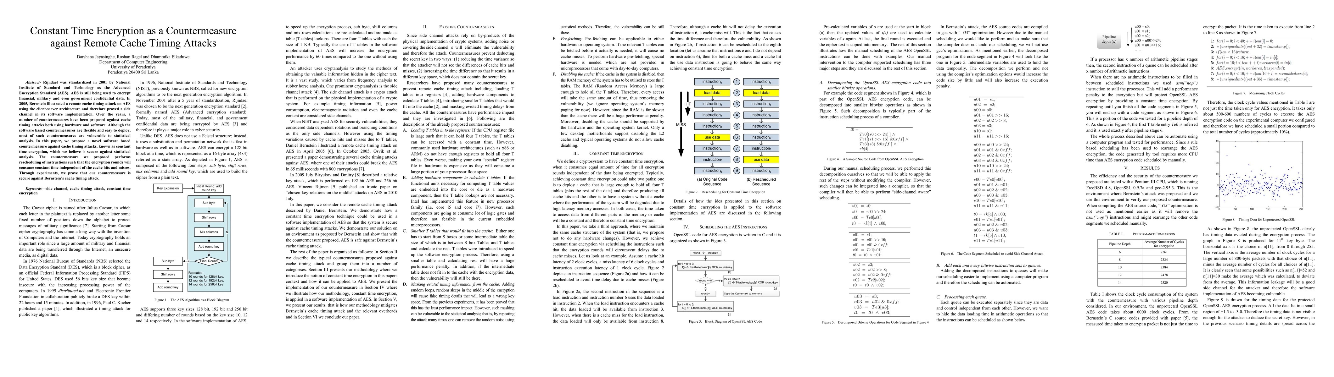 This paper proposes a constant time encryption method to counter remote cache timing attacks on AES, demonstrating its effectiveness through experiments and asserting that it is secure against statistical analysis by ensuring encryption rounds consume constant time regardless of cache hits and misses.