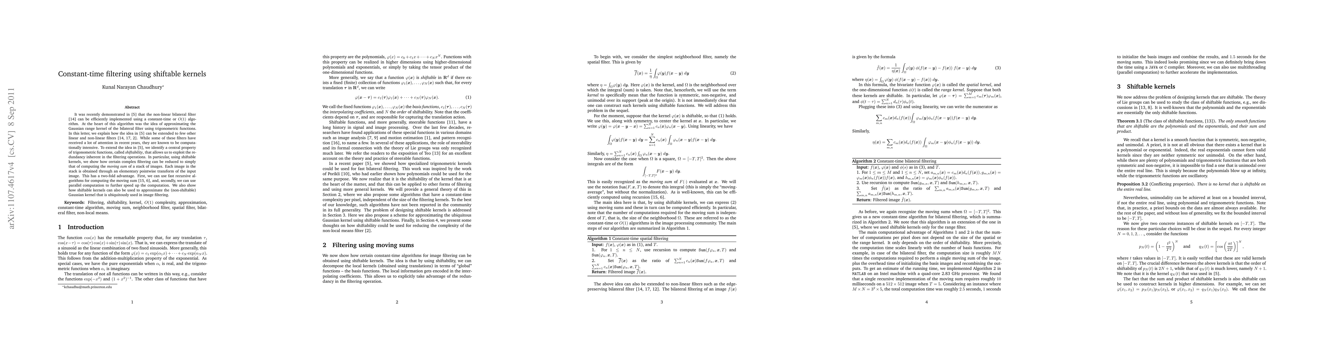 It was recently demonstrated in [5] that the non-linear bilateral filter [14] can be efficiently implemented using a constant-time or O(1) algorithm. At the heart of this algorithm was the idea of approximating the Gaussian range kernel of the bilateral filter using trigonometric functions. In this letter, we explain how the idea in [5] can be extended to few other linear and non-linear filters [14, 17, 2]. While some of these filters have received a lot of attention in recent years, they are known to be computationally intensive. To extend the idea in [5], we identify a central property of trigonometric functions, called shiftability, that allows us to exploit the redundancy inherent in the filtering operations. In particular, using shiftable kernels, we show how certain complex filtering can be reduced to simply that of computing the moving sum of a stack of images. Each image in the stack is obtained through an elementary pointwise transform of the input image. This has a two-fold advantage. First, we can use fast recursive algorithms for computing the moving sum [15, 6], and, secondly, we can use parallel computation to further speed up the computation. We also show how shiftable kernels can also be used to approximate the (non-shiftable) Gaussian kernel that is ubiquitously used in image filtering.