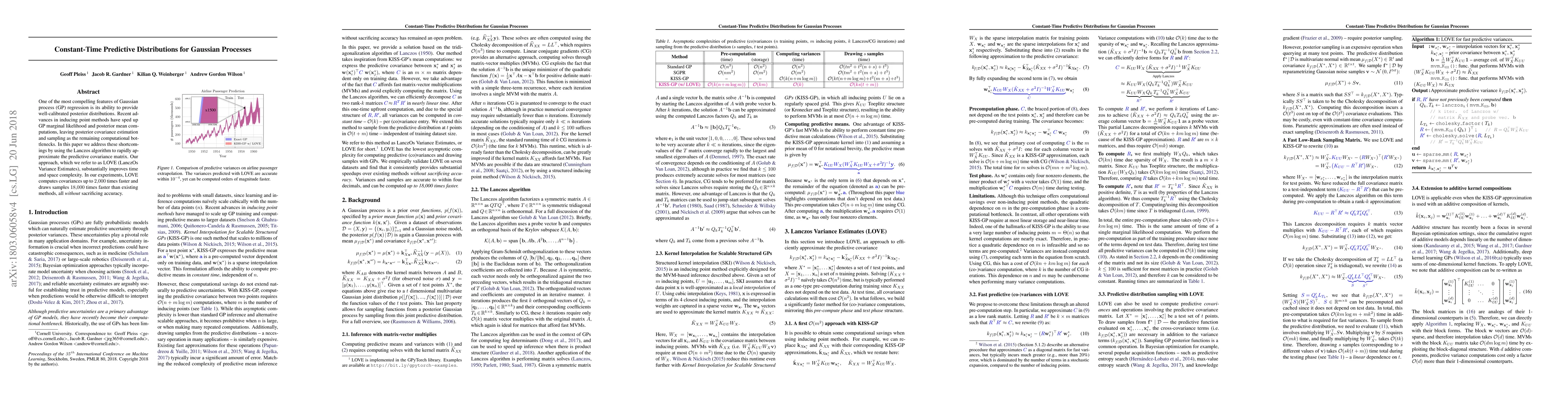 This paper introduces LOVE, a method using the Lanczos algorithm to efficiently approximate predictive covariance matrices in Gaussian processes, significantly reducing computation time and space complexity while maintaining accuracy. Experiments show LOVE computes covariances up to 2,000 times faster and samples 18,000 times faster than existing methods.