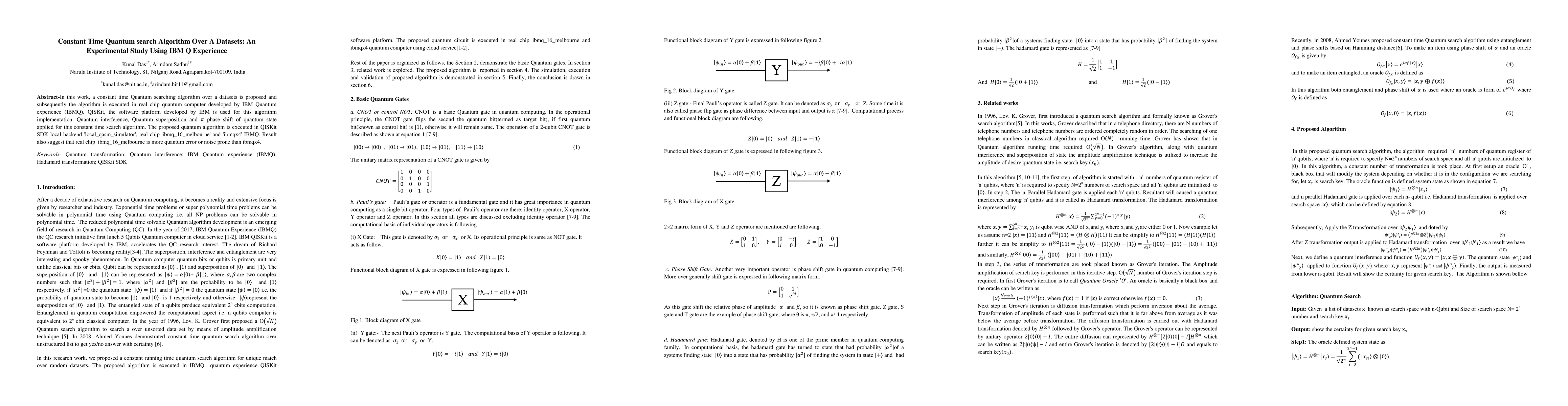 Summary: This research proposes a constant time quantum search algorithm and implements it using IBM's Q Experience platform. Experiments on both local and real quantum chips show that while the algorithm works, the 'ibmq_16_melbourne' chip exhibits higher error rates compared to 'ibmqx4'.