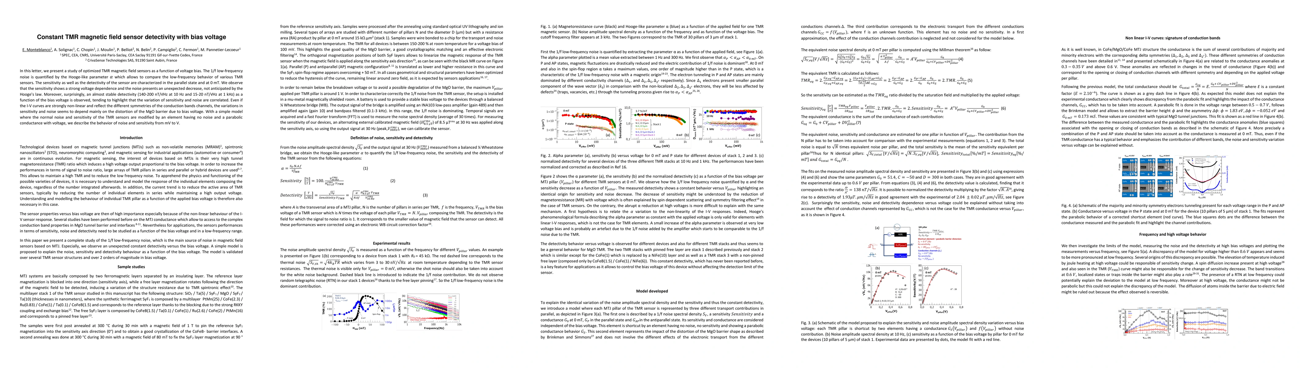 This paper investigates optimized tunneling magnetoresistive (TMR) magnetic field sensors under varying bias voltages, revealing an unexpected decrease in 1/f low-frequency noise despite strong non-linear I-V curves. Despite changes in sensitivity, the detectivity remains surprisingly stable, suggesting a correlation between sensitivity and noise variations, primarily influenced by the distortion of the MgO barrier.
