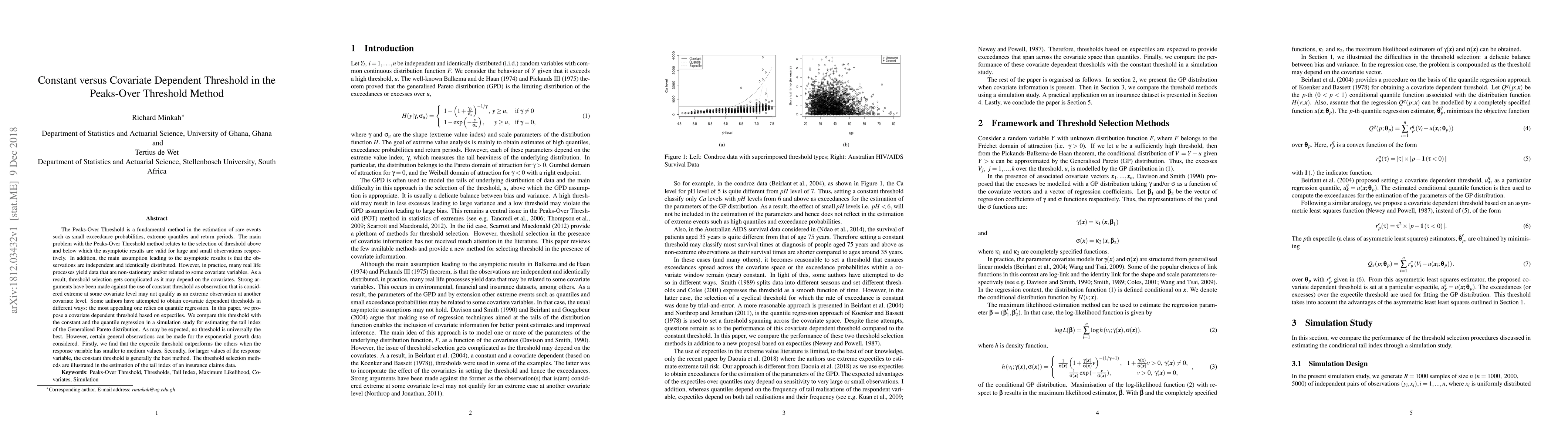 The Peaks-Over Threshold is a fundamental method in the estimation of rare events such as small exceedance probabilities, extreme quantiles and return periods. The main problem with the Peaks-Over Threshold method relates to the selection of threshold above and below which the asymptotic results are valid for large and small observations respectively. In addition, the main assumption leading to the asymptotic results is that the observations are independent and identically distributed. However, in practice, many real life processes yield data that are non-stationary and/or related to some covariate variables. As a result, threshold selection gets complicated as it may depend on the covariates. Strong arguments have been made against the use of constant threshold as observation that is considered extreme at some covariate level may not qualify as an extreme observation at another covariate level. Some authors have attempted to obtain covariate dependent thresholds in different ways: the most appealing one relies on quantile regression. In this paper, we propose a covariate dependent threshold based on expectiles. We compare this threshold with the constant and the quantile regression in a simulation study for estimating the tail index of the Generalised Pareto distribution. As may be expected, no threshold is universally the best. However, certain general observations can be made for the exponential growth data considered. Firstly, we find that the expectile threshold outperforms the others when the response variable has smaller to medium values. Secondly, for larger values of the response variable, the constant threshold is generally the best method. The threshold selection methods are illustrated in the estimation of the tail index of an insurance claims data.