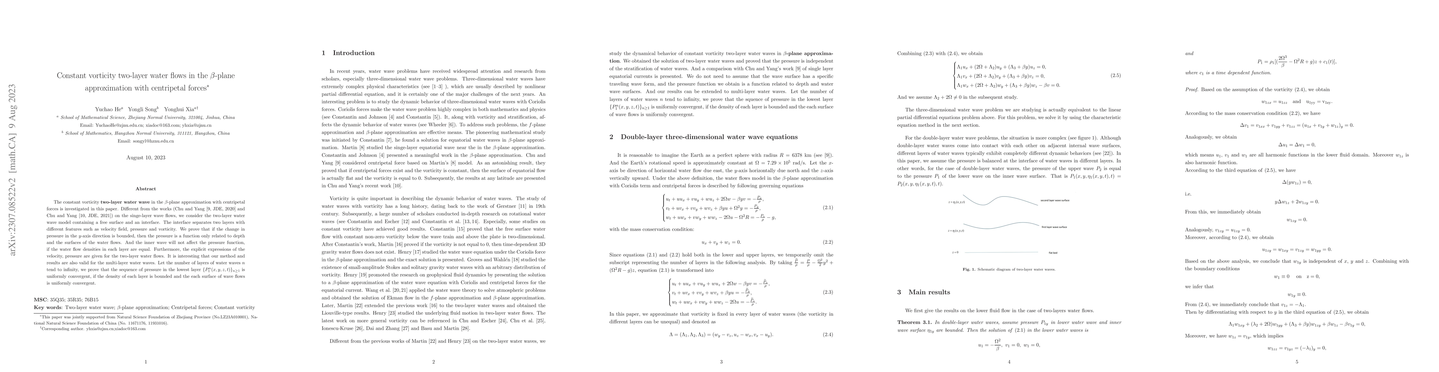 The constant vorticity {\bf two-layer water wave} in the $\beta$-plane approximation with centripetal forces is investigated in this paper. Different from the works (Chu and Yang\cite[JDE, 2020]{chu} and Chu and Yang \cite[JDE, 2021]{chu2}) on the singe-layer wave flows, we consider the two-layer water wave model containing a free surface and an interface. The interface separates two layers with different features such as velocity field, pressure and vorticity. We prove that if the change in pressure in the $y$-axis direction is bounded, then the pressure is a function only related to depth and the surfaces of the water flows. And the inner wave will not affect the pressure function, if the water flow densities in each layer are equal. Furthermore, the explicit expressions of the velocity, pressure are given for the two-layer water flows. It is interesting that our method and results are also valid for the multi-layer water waves. Let the number of layers of water waves $n$ tend to infinity, we prove that the squence of pressure in the lowest layer $\{P_1^n(x,y,z,t)\}_{n\geq1}$ is uniformly convergent, if the density of each layer is bounded and the each surface of wave flows is uniformly convergent.