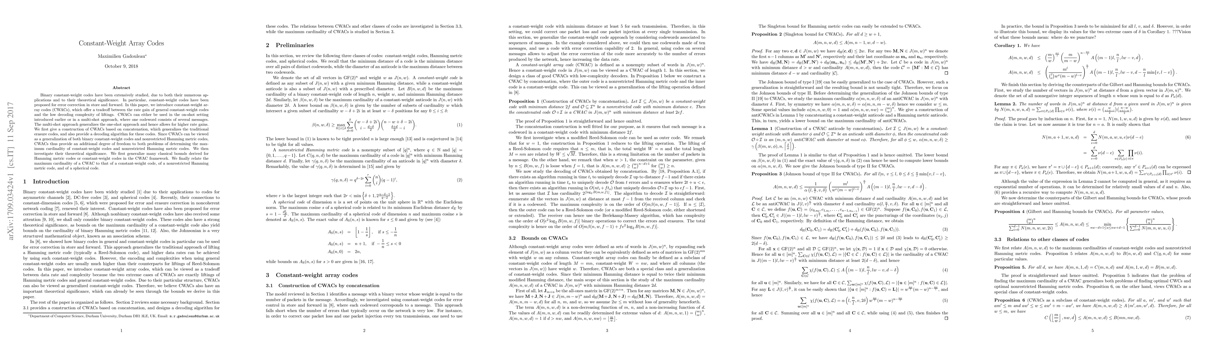 Binary constant-weight codes have been extensively studied, due to both their numerous applications and to their theoretical significance. In particular, constant-weight codes have been proposed for error correction in store and forward. In this paper, we introduce constant-weight array codes (CWACs), which offer a tradeoff between the rate gain of general constant-weight codes and the low decoding complexity of liftings. CWACs can either be used in the on-shot setting introduced earlier or in a multi-shot approach, where one codeword consists of several messages. The multi-shot approach generalizes the one-shot approach and hence allows for higher rate gains. We first give a construction of CWACs based on concatenation, which generalizes the traditional erasure codes, and also provide a decoding algorithm for these codes. Since CWACs can be viewed as a generalization of both binary constant-weight codes and nonrestricted Hamming metric codes, CWACs thus provide an additional degree of freedom to both problems of determining the maximum cardinality of constant-weight codes and nonrestricted Hamming metric codes. We then investigate their theoretical significance. We first generalize many classical bounds derived for Hamming metric codes or constant-weight codes in the CWAC framework. We finally relate the maximum cardinality of a CWAC to that of a constant-weight code, of a nonrestricted Hamming metric code, and of a spherical code.