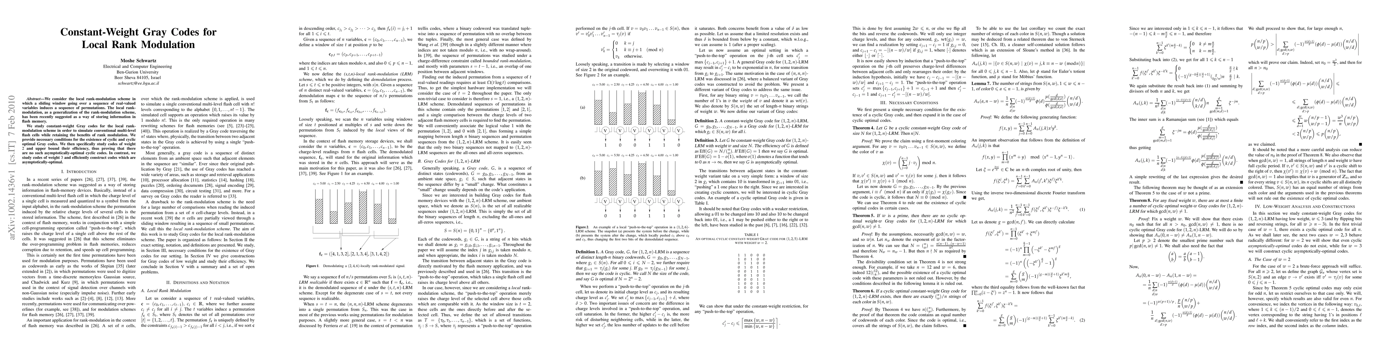 This paper explores constant-weight Gray codes for local rank-modulation schemes, which generalize rank-modulation for storing information in flash memory. It establishes conditions for cyclic and optimal Gray codes, proving that weight-2 codes cannot be asymptotically optimal, while weight-3 codes can be efficiently constructed to achieve asymptotic optimality.