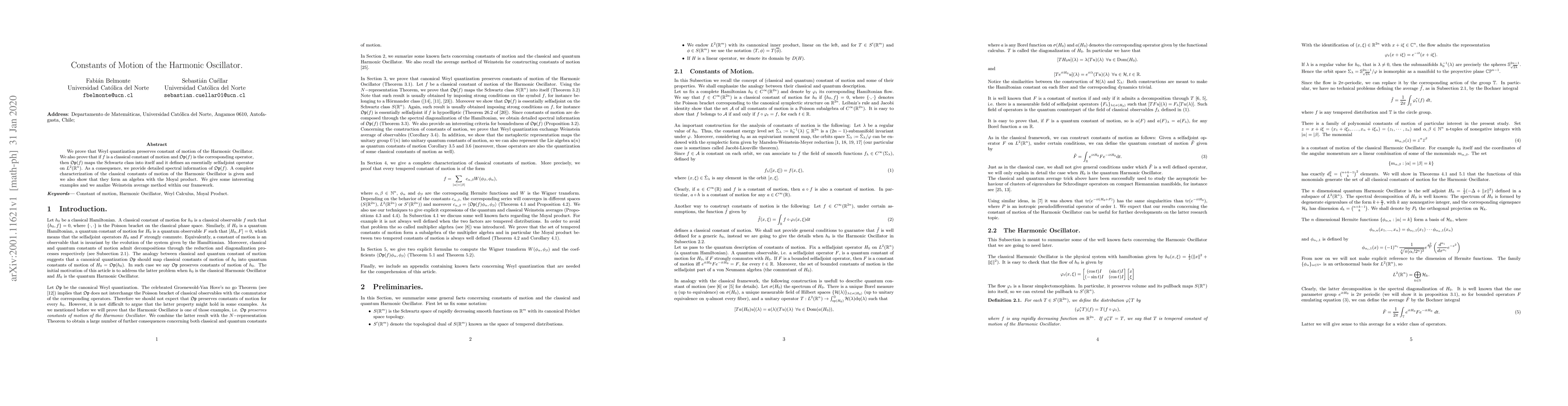 This paper proves that Weyl quantization maintains the constants of motion for the Harmonic Oscillator, showing that corresponding operators map the Schwartz class into itself and are essentially selfadjoint on $L^2(\mathbb R^n)$. It also characterizes these classical constants and demonstrates their algebraic structure with the Moyal product.
