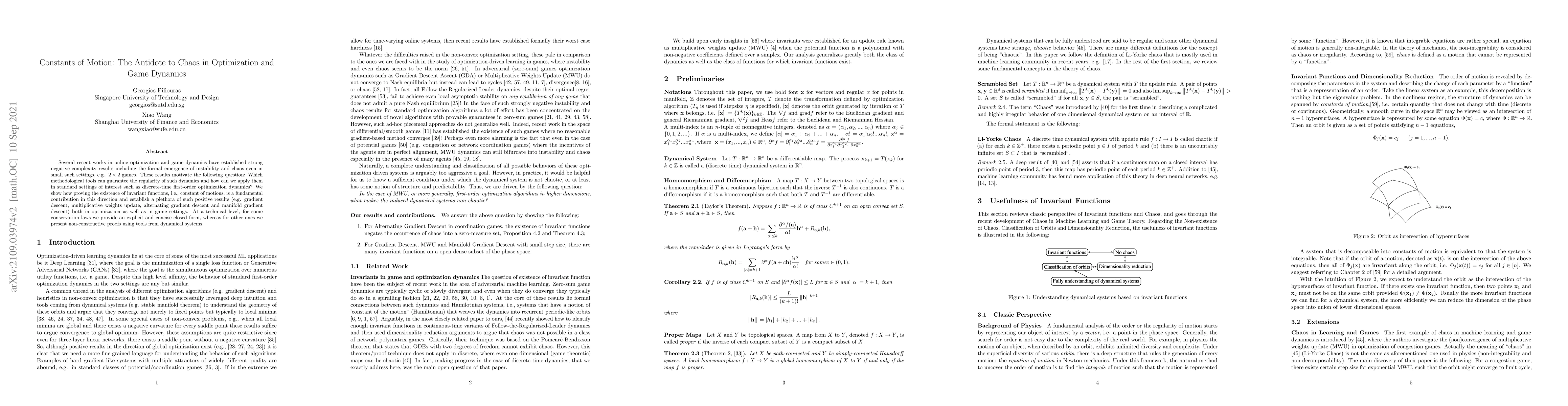 This paper investigates the role of invariant functions, or constants of motion, in stabilizing chaotic dynamics in optimization and game theory. It demonstrates that proving the existence of such invariants can ensure regularity in dynamics, providing positive results for methods like gradient descent and multiplicative weights update.