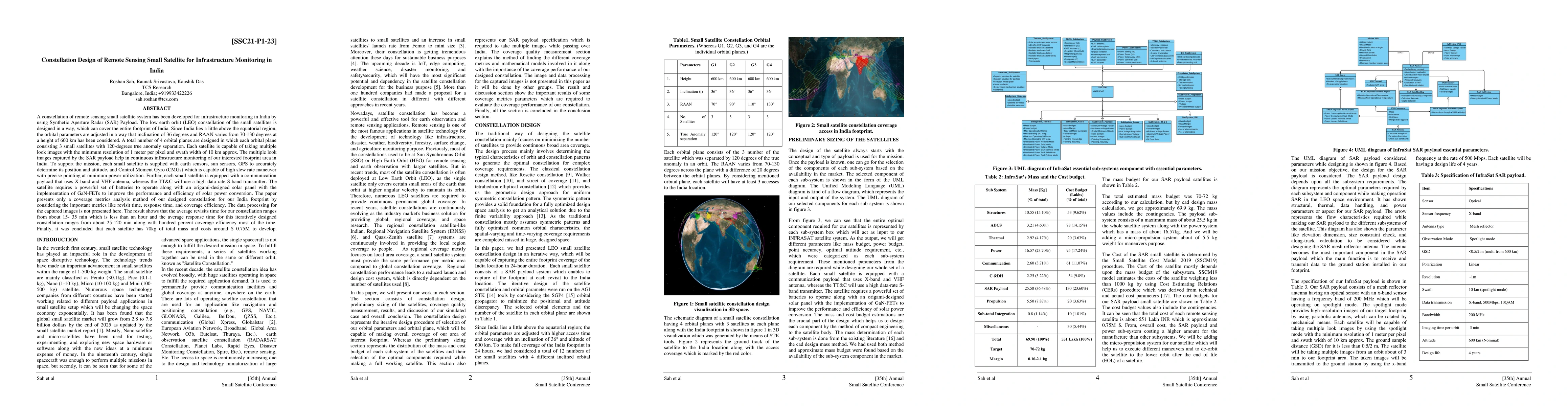 A constellation of remote sensing small satellite system has been developed for infrastructure monitoring in India by using SAR Payload. The LEO constellation of the small satellites is designed in a way, which can cover the entire footprint of India. Since India lies a little above the equatorial region, the orbital parameters are adjusted in a way that inclination of 36 degrees and RAAN varies from 70-130 degrees at a height of 600 km has been considered. A total number of 4 orbital planes are designed in which each orbital plane consisting 3 small satellites with 120-degrees true anomaly separation. Each satellite is capable of taking multiple look images with the minimum resolution of 1 meter per pixel and swath width of 10 km approx. The multiple look images captured by the SAR payload help in continuous infrastructure monitoring of our interested footprint area in India. Each small satellite is equipped with a communication payload that uses X-band and VHF antenna, whereas the TT&C will use a high data-rate S-band transmitter. The paper presents only a coverage metrics analysis method of our designed constellation for our India footprint by considering the important metrics like revisit time, response time, and coverage efficiency. The result shows that the average revisits time for our constellation ranges from about 15- 35 min which is less than an hour and the average response time for this iteratively designed constellation ranges from about 25-120 min along with hundred percent coverage efficiency most of the time. Finally, it was concluded that each satellite has 70kg of total mass and costs around $ 0.75M to develop.