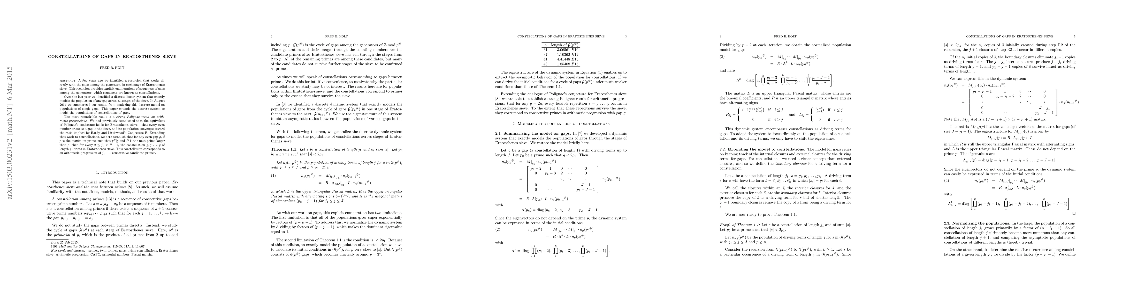 A few years ago we identified a recursion that works directly with the gaps among the generators in each stage of Eratosthenes sieve. This recursion provides explicit enumerations of sequences of gaps among the generators, which sequences are known as constellations. Over the last year we identified a discrete linear system that exactly models the population of any gap across all stages of the sieve. In August 2014 we summarized our results from analyzing this discrete model on populations of single gaps. This paper extends the discrete system to model the populations of constellations of gaps. The most remarkable result is a strong Polignac result on arithmetic progressions. We had previously established that the equivalent of Polignac's conjecture holds for Eratosthenes sieve -- that every even number arises as a gap in the sieve, and its population converges toward the ratio implied by Hardy and Littlewood's Conjecture B. Extending that work to constellations, we here establish that for any even gap $g$, if $p$ is the maximum prime such that $p\# \; | g$ and $P$ is the next prime larger than $p$, then for every $2 \le j_1 < P-1$, the constellation $g,g,\ldots,g$ of length $j_1$ arises in Eratosthenes sieve. This constellation corresponds to an arithmetic progression of $j_1+1$ consecutive candidate primes.
