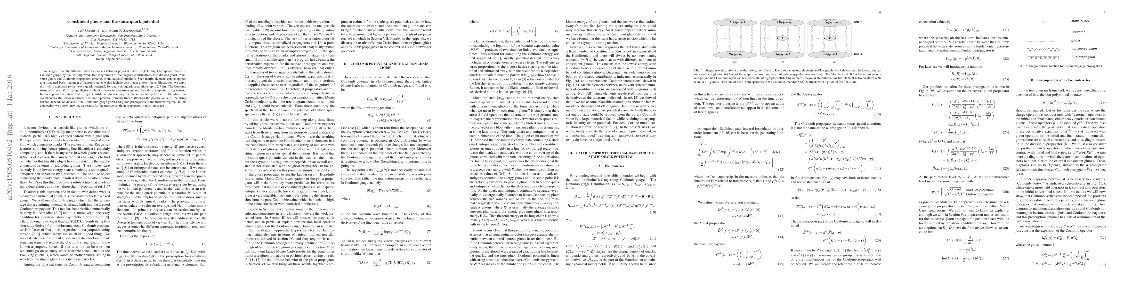 We suggest that Hamiltonian matrix elements between physical states in QCD might be approximated, in Coulomb gauge, by "lattice-improved" tree diagrams; i.e. tree diagram contributions with dressed ghost, transverse gluon, and Coulomb propagators obtained from lattice simulations. Such matrix elements can be applied to a truncated-basis treatment of hadronic states which include constituent gluons. As an illustration, we apply this hybrid approach to the heavy quark potential, for quark-antiquark separations up to 2.4 fm. The Coulomb string tension in SU(3) gauge theory is about a factor of four times greater than the asymptotic string tension. In our approach we show that a single constituent gluon is in principle sufficient, up to 2.4 fm, to reduce this overshoot by the factor required. The static potential remains linear, although the precise value of the string tension depends on details of the Couloumb gauge ghost and gluon propagators in the infrared regime. In this connection we present new lattice results for the transverse gluon propagator in position space.