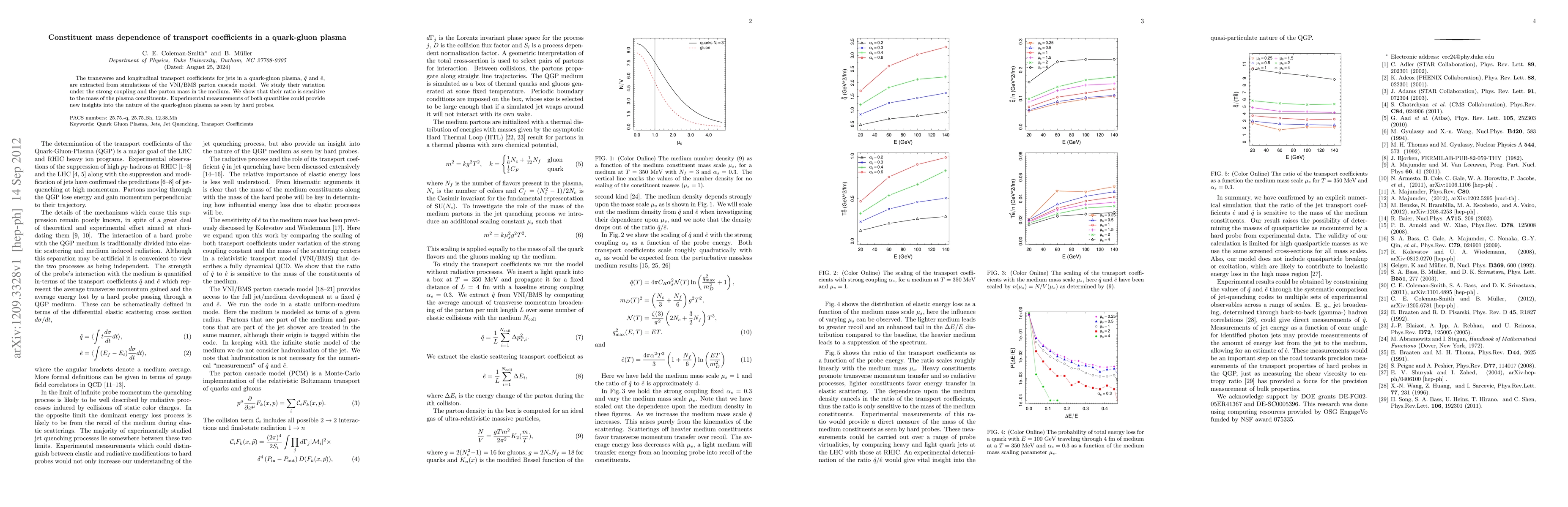 This paper investigates the dependence of transverse and longitudinal transport coefficients in a quark-gluon plasma, $\hat{q}$ and $\hat{e}$, on the mass of plasma constituents using the VNI/BMS parton cascade model. The study reveals that the ratio of these coefficients is sensitive to the constituent mass, offering potential insights into the plasma's nature through experimental measurements.