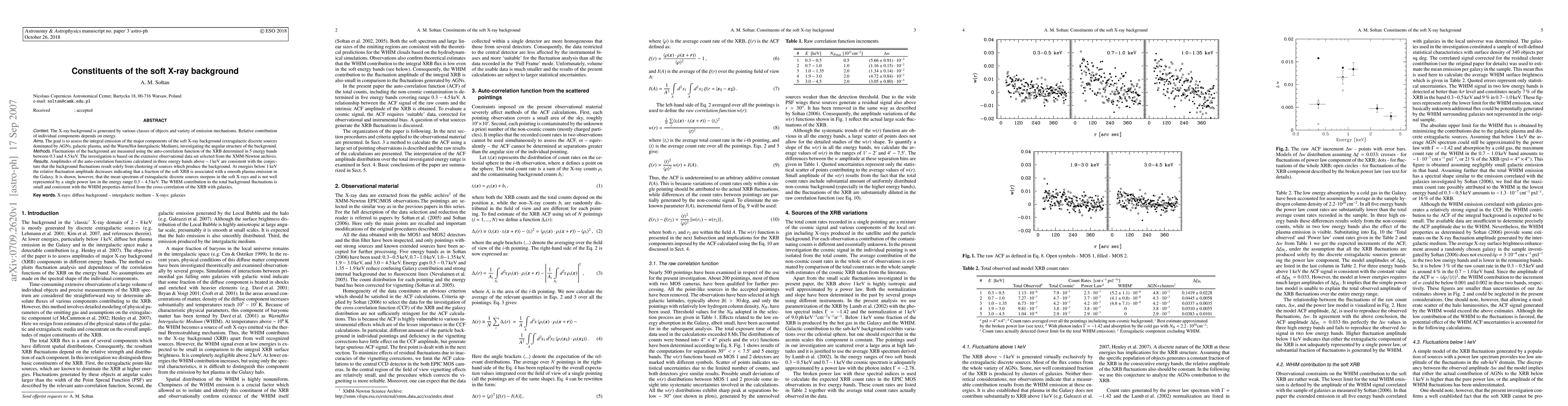 The X-ray background is generated by various classes of objects and variety of emission mechanisms. Relative contribution of individual components depends on energy. The goal is to assess the integral emission of the major components of the soft X-ray background (extragalactic discrete sources dominated by AGNs, galactic plasma, and the Warm/Hot Intergalactic Medium), investigating the angular structure of the background. Fluctuations of the background are measured using the auto-correlation function of the XRB determined in 5 energy bands between 0.3 and 4.5 keV. The investigation is based on the extensive observational data set selected from the XMM-Newton archives. Amplitudes of the auto-correlation functions calculated in three energy bands above ~1 keV are consistent with the conjecture that the background fluctuations result solely from clustering of sources which produce the background. At energies below 1 keV the relative fluctuation amplitude decreases indicating that a fraction of the soft XRB is associated with a smooth plasma emission in the Galaxy. It is shown, however, that the mean spectrum of extragalactic discrete sources steepens in the soft X-rays and is not well represented by a single power law in the energy range 0.3-4.5 keV. The WHIM contribution to the total background fluctuations is small and consistent with the WHIM properties derived from the cross-correlation of the XRB with galaxies.