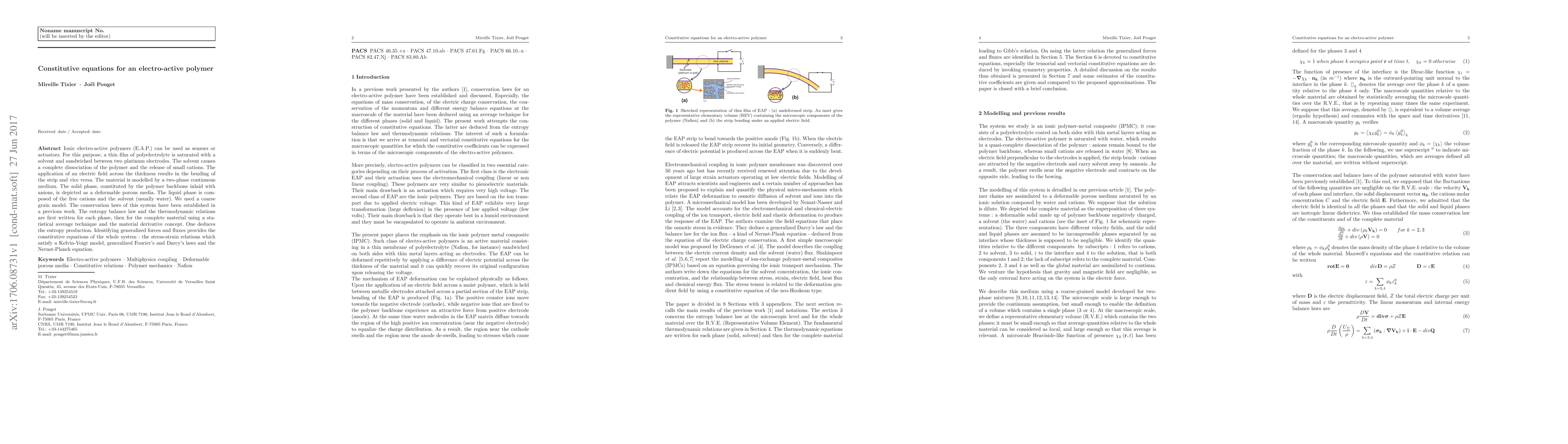 Ionic electro-active polymers (E.A.P.) can be used as sensors or actuators. For this purpose, a thin film of polyelectrolyte is saturated with a solvent and sandwiched between two platinum electrodes. The solvent causes a complete dissociation of the polymer and the release of small cations. The application of an electric field across the thickness results in the bending of the strip and vice versa. The material is modelled by a two-phase continuous medium. The solid phase, constituted by the polymer backbone inlaid with anions, is depicted as a deformable porous media. The liquid phase is composed of the free cations and the solvent (usually water). We used a coarse grain model. The conservation laws of this system have been established in a previous work. The entropy balance law and the thermodynamic relations are first written for each phase, then for the complete material using a statistical average technique and the material derivative concept. One deduces the entropy production. Identifying generalized forces and fluxes provides the constitutive equations of the whole system : the stress-strain relations which satisfy a Kelvin-Voigt model, generalized Fourier's and Darcy's laws and the Nernst-Planck equation.