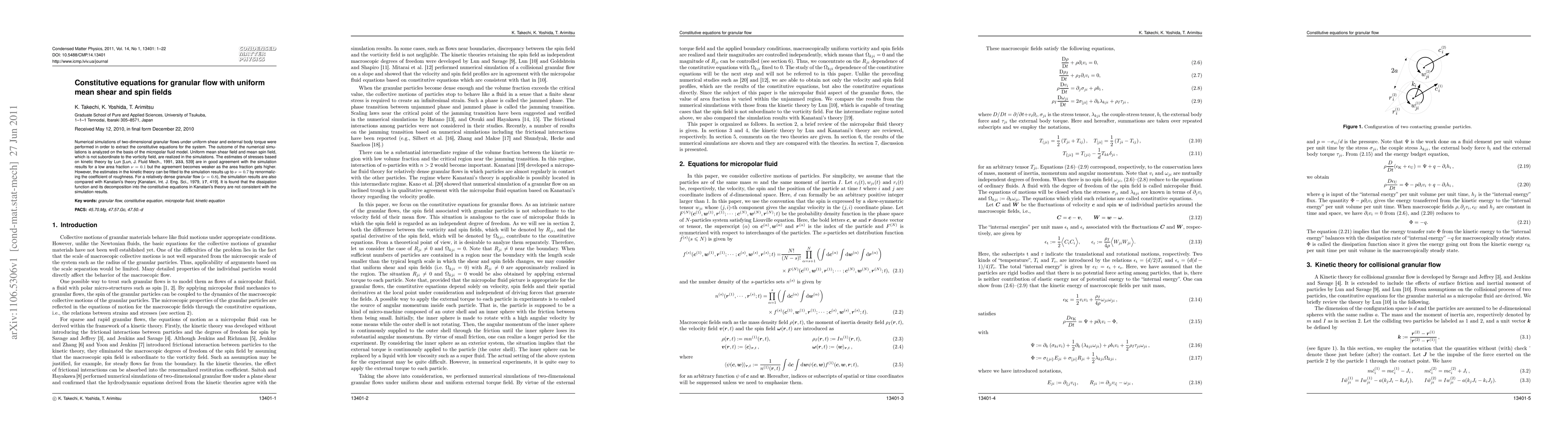 This paper presents numerical simulations of two-dimensional granular flows under uniform shear and external torque to derive constitutive equations. The results align well with kinetic theory estimates at low densities but require renormalization for higher densities, and diverge from Kanatani's theory for dense flows.