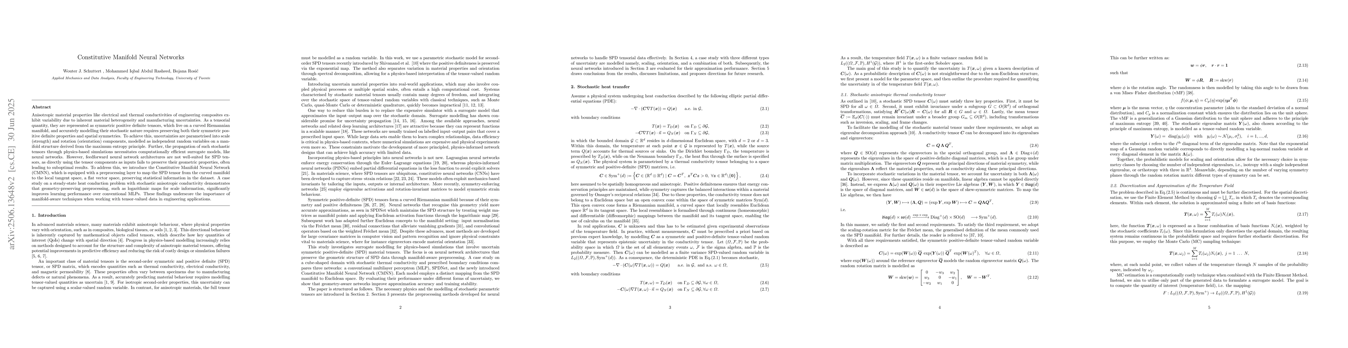 Important material properties like thermal conductivity are often represented as symmetric positive definite (SPD) tensors, which exhibit variability due to inherent material heterogeneity and manufacturing uncertainties. These tensors reside on a curved Riemannian manifold, and accurately modeling their stochastic nature requires preserving both their symmetric positive definite properties and spatial symmetries. To achieve this, uncertainties are parametrized into scaling (magnitude) and rotation (orientation) components, modeled as independent random variables on a manifold structure derived from the maximum entropy principle. The propagation of such stochastic tensors through physics-based simulations necessitates computationally efficient surrogate models. However, traditional multi-layer perceptron (MLP) architectures are not well-suited for SPD tensors, as directly inputting their components fails to preserve their geometric properties, often leading to suboptimal results. To address this, we introduce Constitutive Manifold Neural Networks (CMNN). This approach introduces a preprocessing layer by mapping the SPD tensor from the curved manifold to the local tangent, a flat vector space, creating an information preserving map for input to the hidden layers of the neural networks. A case study on a steady-state heat conduction problem with stochastic anisotropic conductivity demonstrates that geometry-preserving preprocessing, such as logarithmic maps for scaling data, significantly improves learning performance over conventional MLPs. These findings underscore the importance of manifold-aware techniques when working with tensor-valued data in engineering applications.
