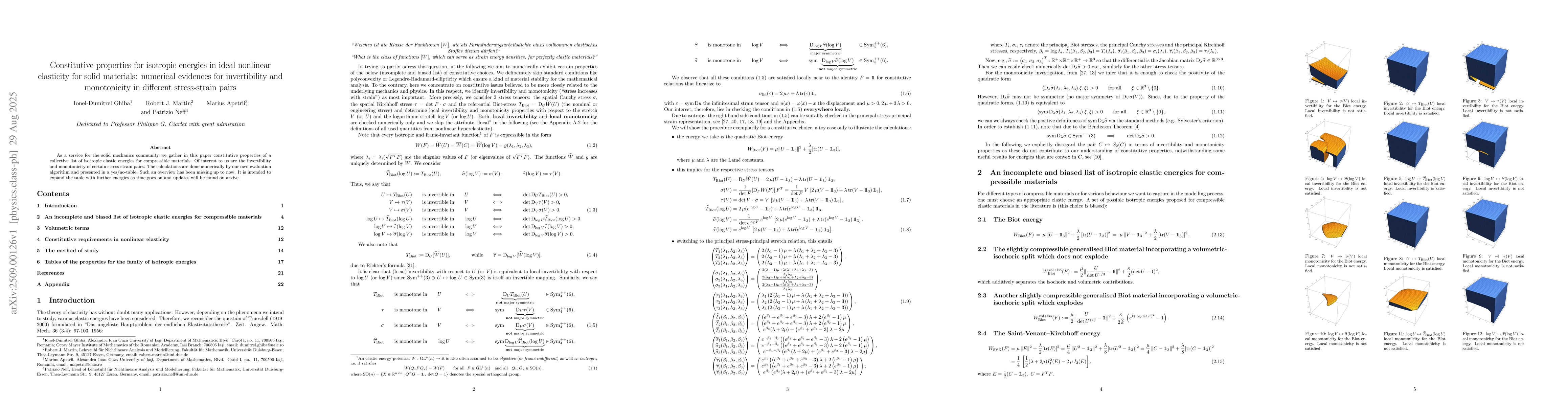 As a service for the solid mechanics community we gather in this paper constitutive properties of a collective list of isotropic elastic energies for compressible materials. Of interest to us are the invertibility and monotonicity of certain stress-strain pairs. The calculations are done numerically by our own evaluation algorithm and presented in a yes/no-table. Such an overview has been missing up to now. It is intended to expand the table with further energies as time goes on and updates will be found on arxive.