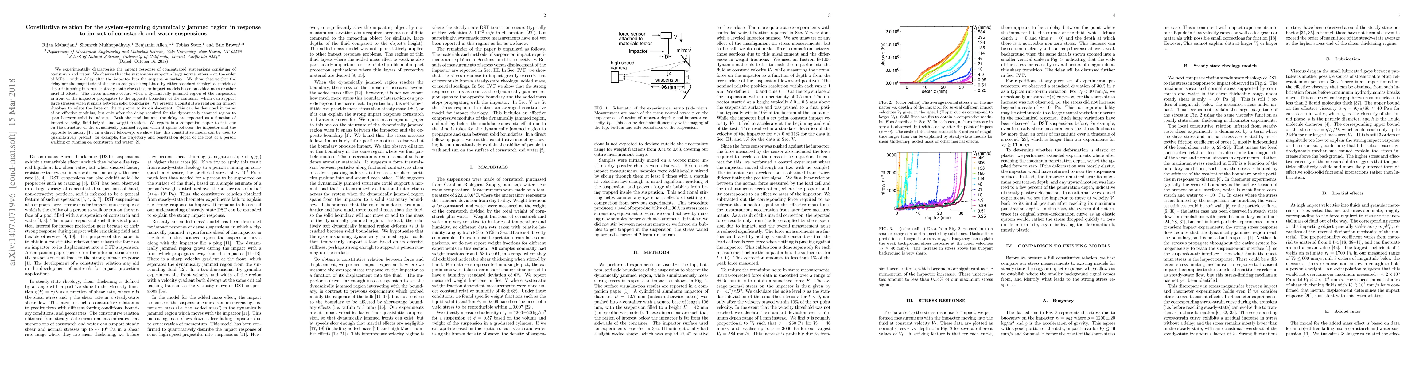 This study experimentally characterizes the impact response of cornstarch-water suspensions, revealing a dynamically jammed region that supports large stresses after a delay. A new constitutive relation is proposed to describe the force-displacement relationship, incorporating an effective modulus dependent on impact velocity and suspension properties.