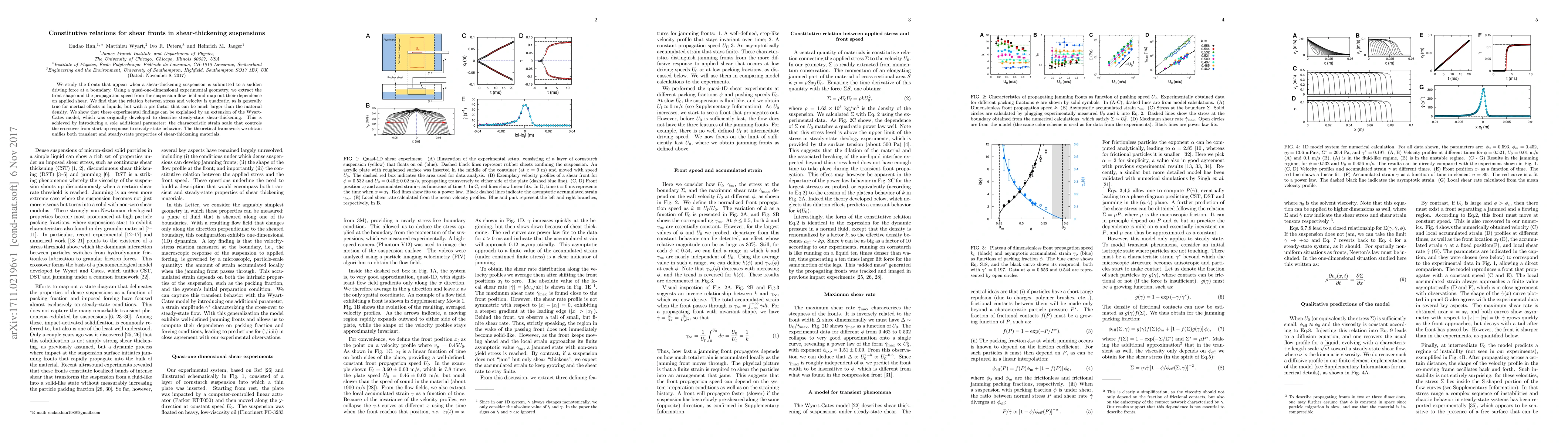 We study the fronts that appear when a shear-thickening suspension is submitted to a sudden driving force at a boundary. Using a quasi-one-dimensional experimental geometry, we extract the front shape and the propagation speed from the suspension flow field and map out their dependence on applied shear. We find that the relation between stress and velocity is quadratic, as is generally true for inertial effects in liquids, but with a pre-factor that can be much larger than the material density. We show that these experimental findings can be explained by an extension of the Wyart-Cates model, which was originally developed to describe steady-state shear-thickening. This is achieved by introducing a sole additional parameter: the characteristic strain scale that controls the crossover from start-up response to steady-state behavior. The theoretical framework we obtain unifies both transient and steady-state properties of shear-thickening materials.