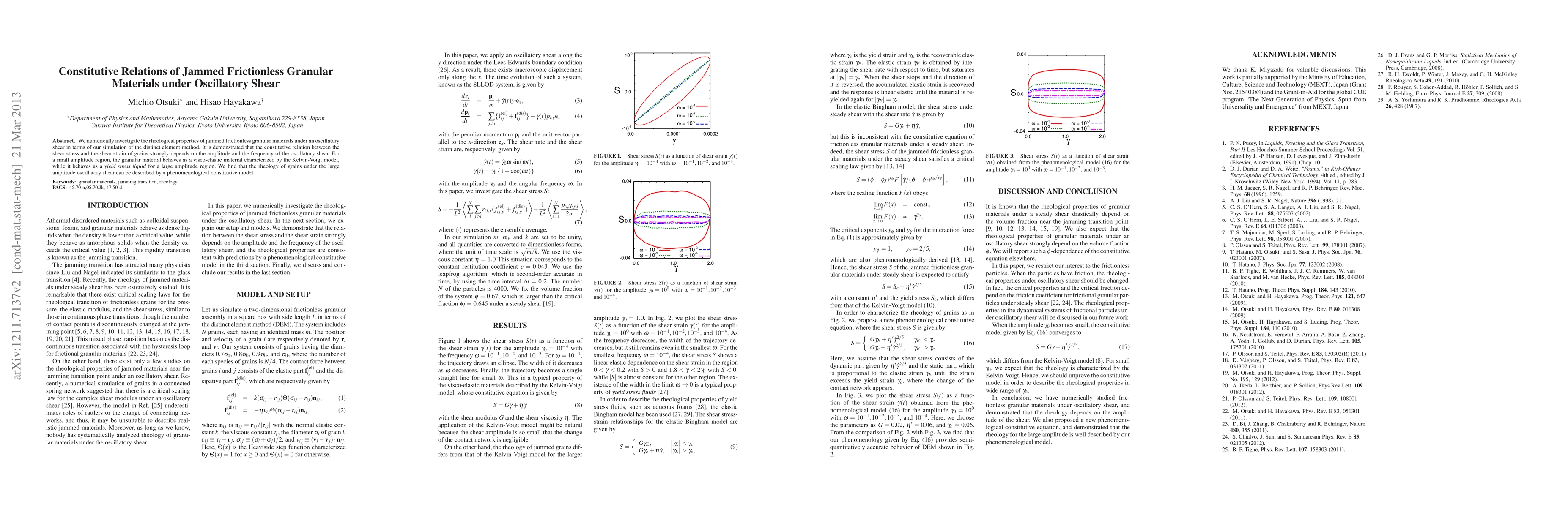 The study numerically investigates the rheological properties of jammed frictionless granular materials under oscillatory shear using the distinct element method (DEM).