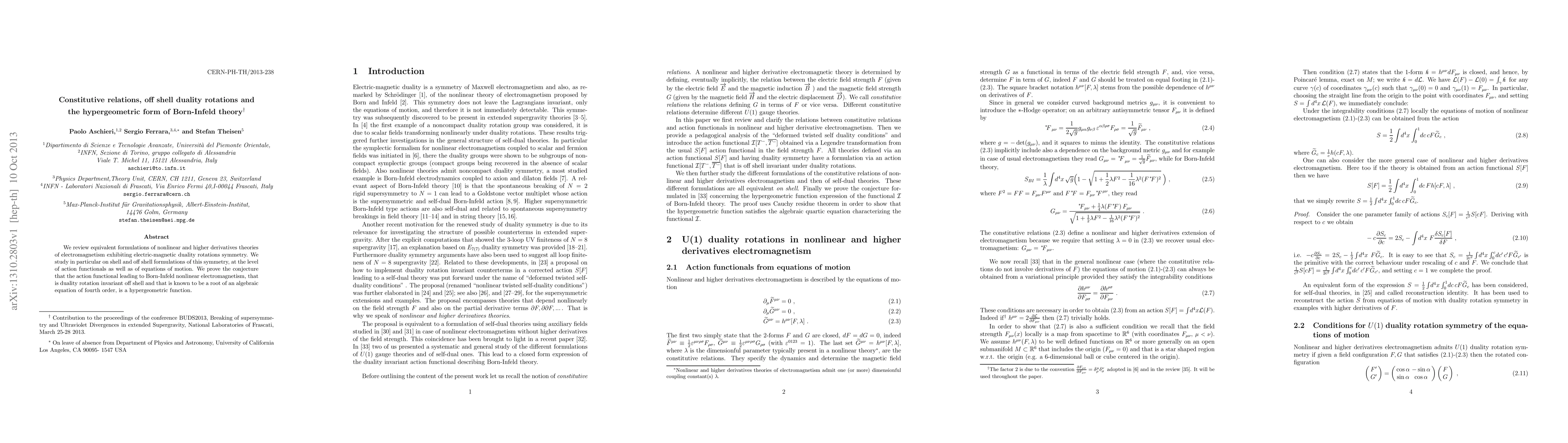 This paper reviews nonlinear electromagnetism theories with electric-magnetic duality and proves that the off-shell action functional for Born-Infeld theory, invariant under duality rotations, is a hypergeometric function, confirming a conjecture.