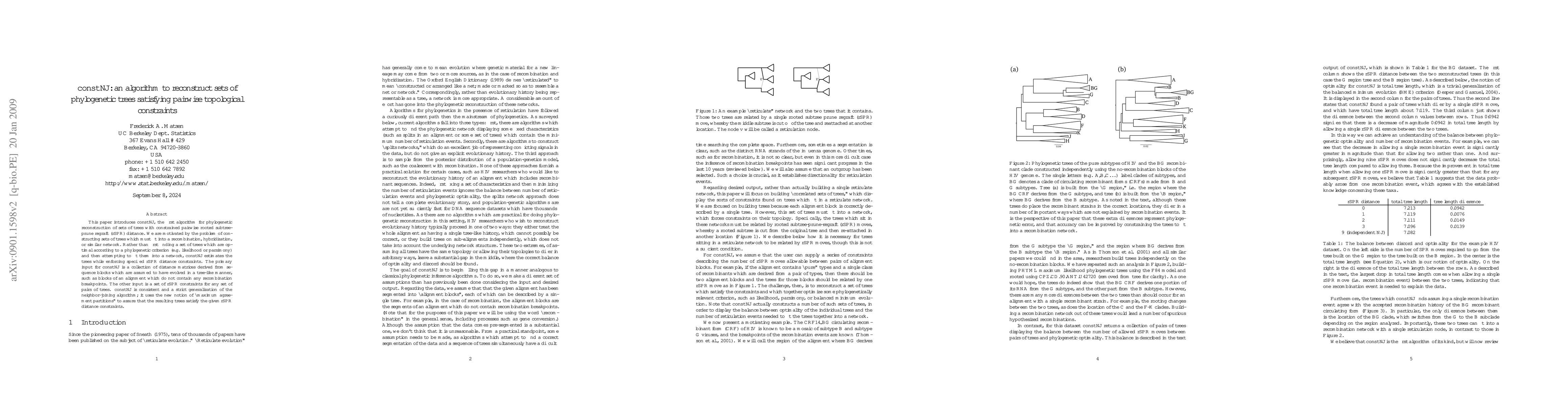 constNJ is an innovative algorithm designed to reconstruct sets of phylogenetic trees that adhere to specified pairwise rooted subtree-prune-regraft (rSPR) distance constraints, directly addressing the need for trees fitting within recombination or hybridization networks. It generalizes the neighbor-joining algorithm by employing "maximum agreement partitions" to ensure the resulting trees meet the rSPR constraints.