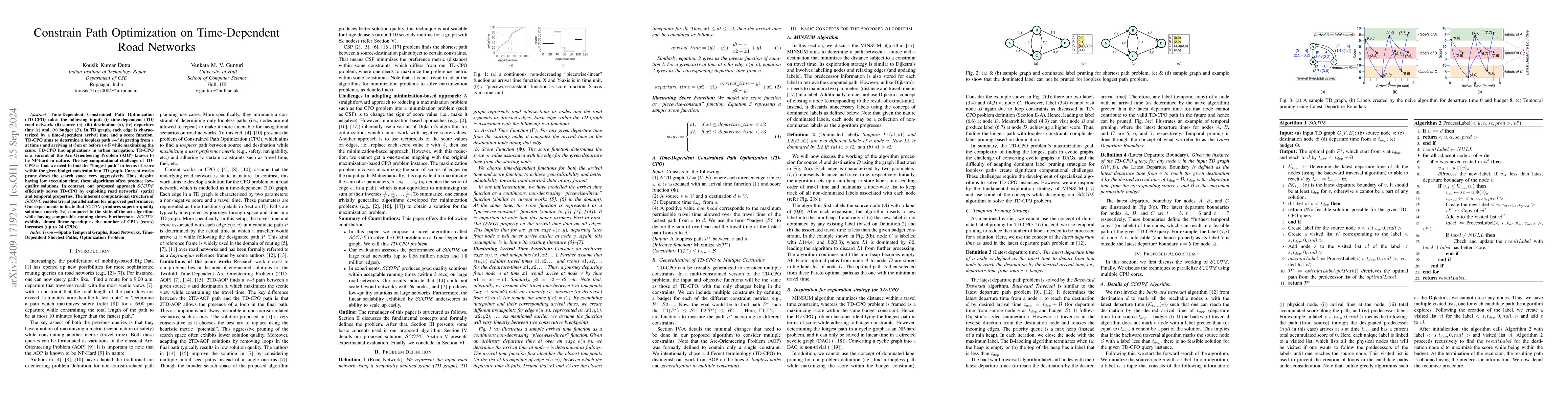 The paper introduces $\mathcal{SCOPE}$, a novel algorithm for Time-Dependent Constrained Path Optimization (TD-CPO) in road networks, aiming to find the highest-scoring loopless path from source to destination within a budget constraint. $\mathcal{SCOPE}$ outperforms existing methods in solution quality while maintaining competitive execution times and demonstrating near-linear scalability with multiple CPUs.